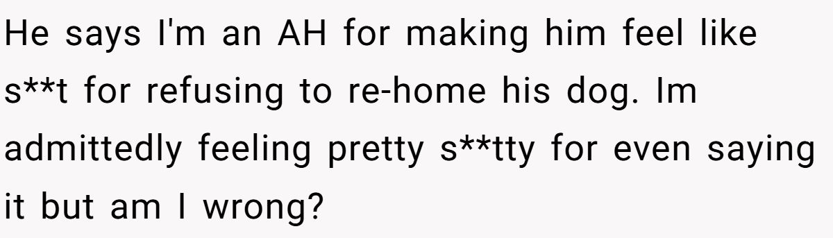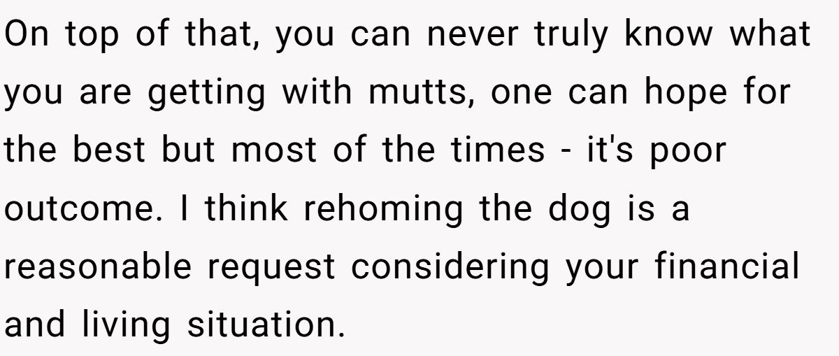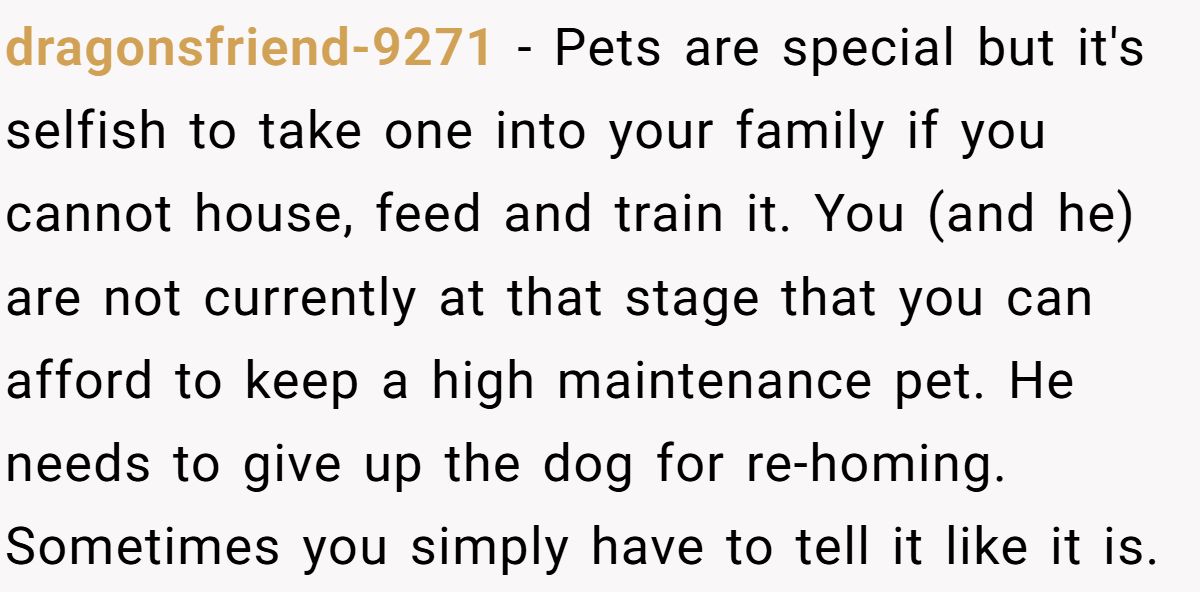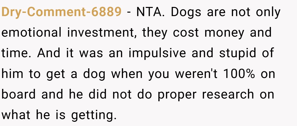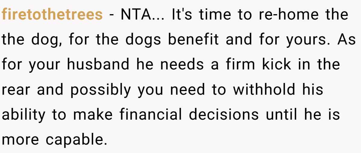 Others agreed: NTA. They said the husband was selfish for buying a dog he couldn’t afford and urged OP to rehome it and set firm financial boundaries—or consider leaving him.
