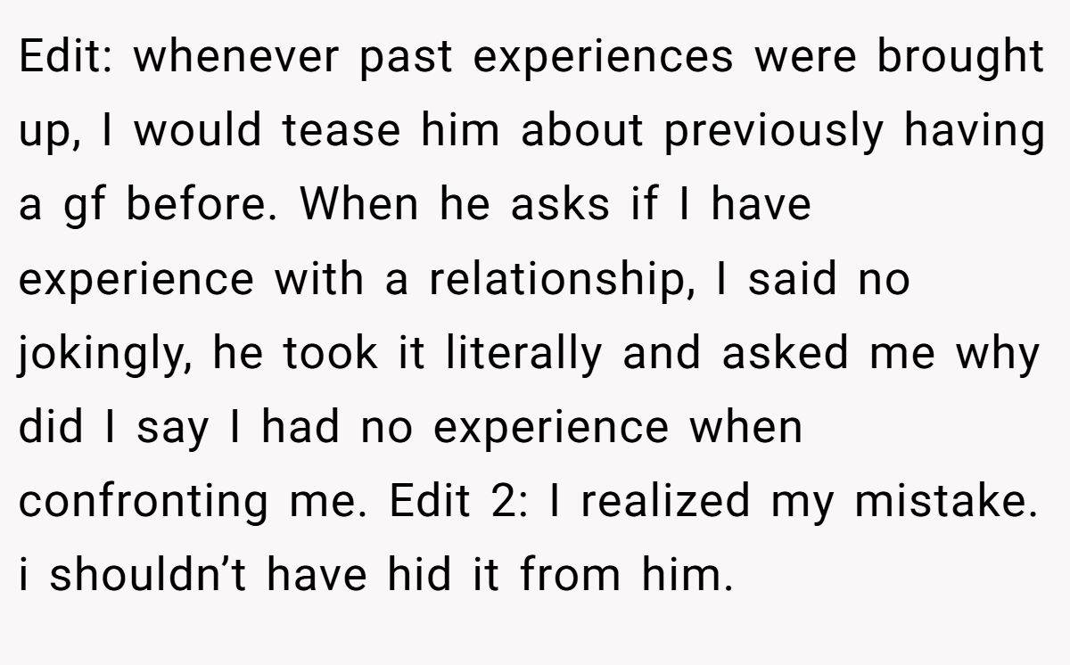 Mia’s fear is something a lot of people can relate to. Early in a relationship, there’s pressure to be perfect, to not mess up the connection. So when past relationships or serious life stuff came up, she joked, dodged, and kept quiet. She wasn’t trying to deceive him — she was scared of losing something that finally felt good.