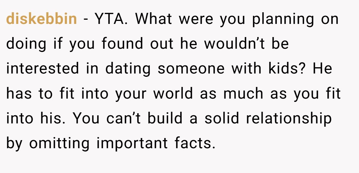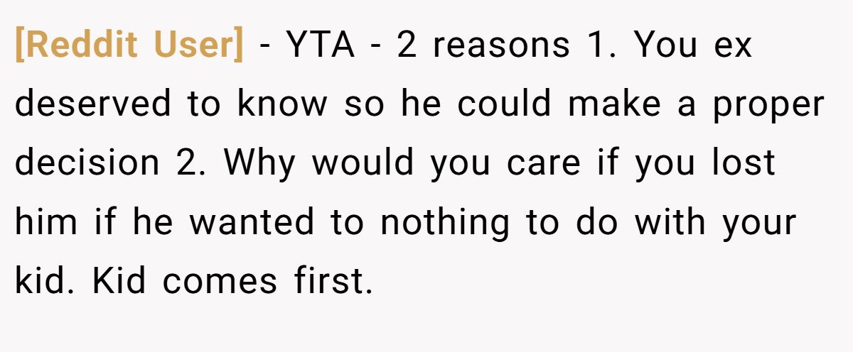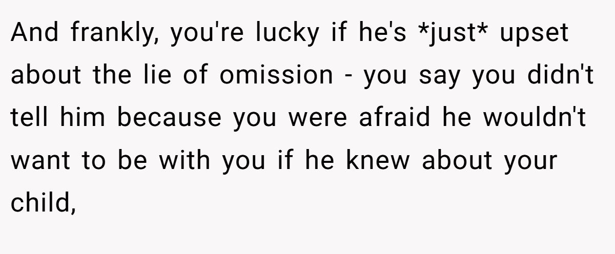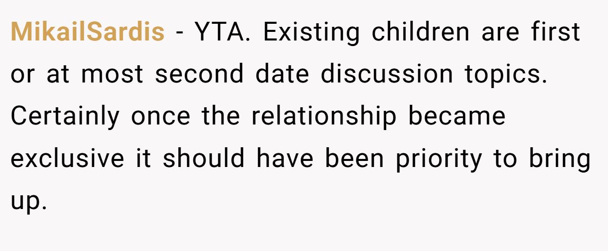 One commenter didn’t mince words, saying Mia crossed a line. To them, hiding a child isn’t just nervousness, it’s a serious breach of trust. If she feared he’d leave after finding out, that was all the more reason to tell him upfront.