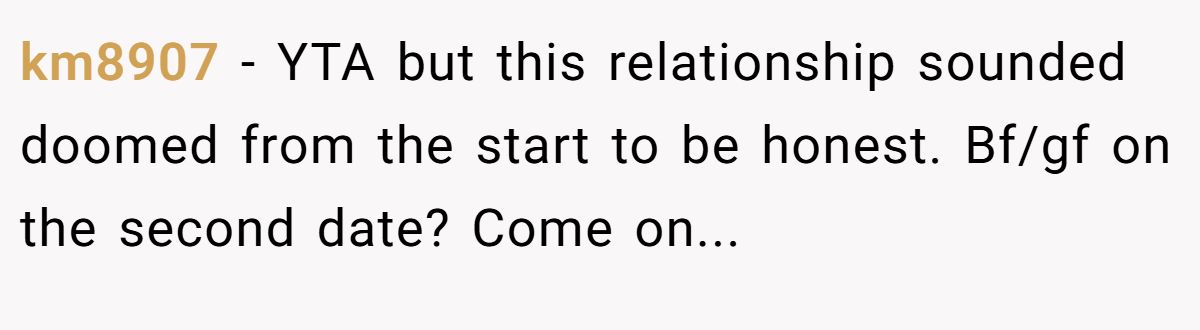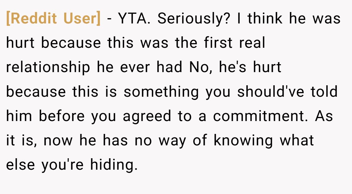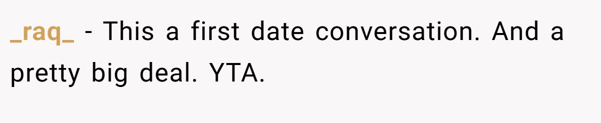 Redditor raq didn’t mince words, calling it a “first date conversation” and emphasizing how serious it is. From their point of view, waiting weeks to disclose something so major crossed the line, making Mia firmly the one at fault.