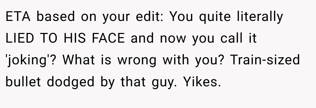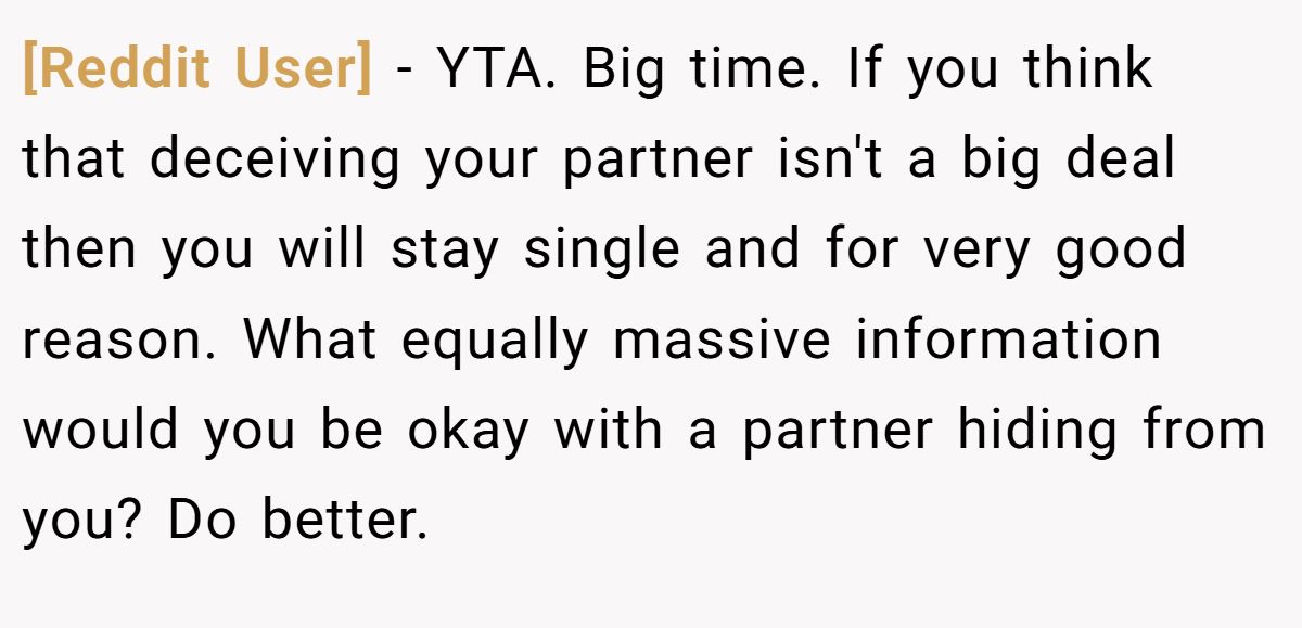 They argued that honesty is non-negotiable in a relationship, and if she thinks this kind of deception is small, she’s not ready for something real. In their words, her ex dodged a bullet the size of a train.