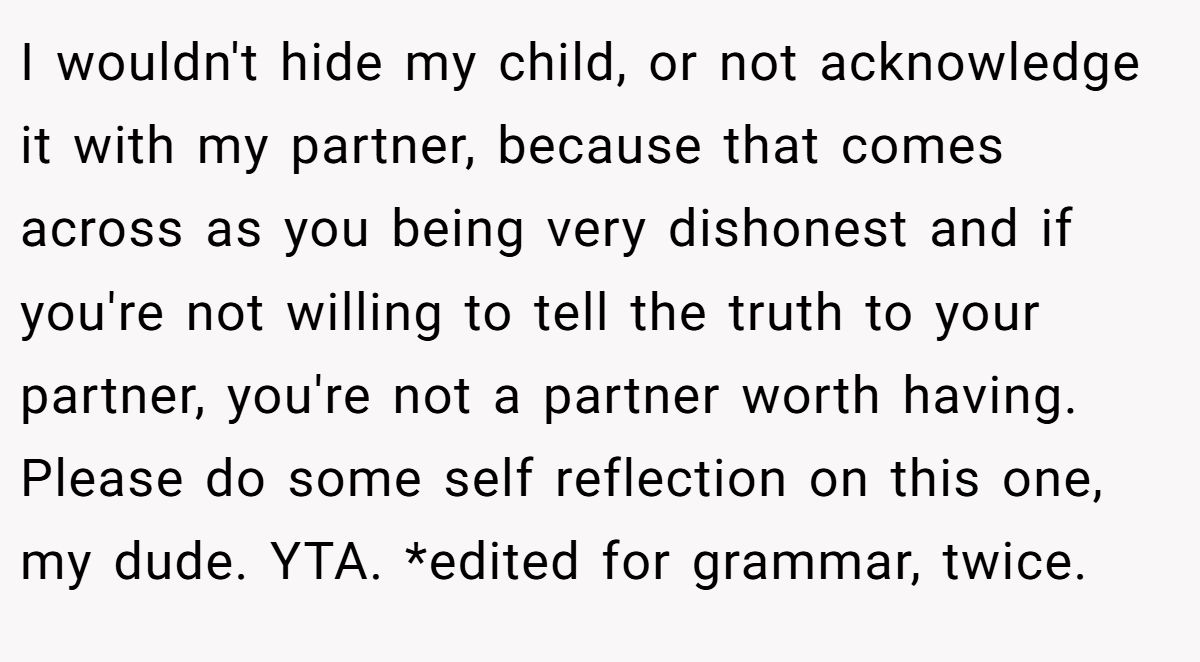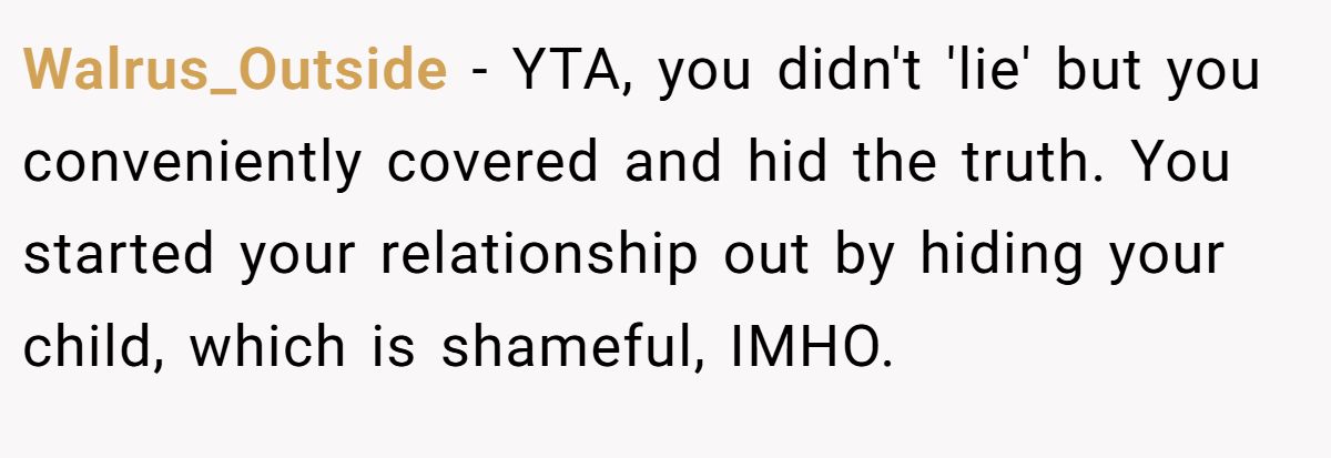 Redditor Walrus_Outside didn’t sugarcoat it. They argued that even if Mia didn’t technically lie, hiding her child was still a serious breach of trust.