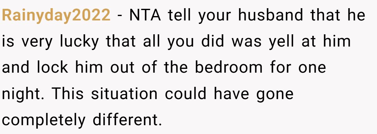 That night, what should have been a sweet homecoming curdled into a standoff. She slammed the bedroom door, locked it tight, and left him to sleep alone in the guest room. Some would say her reaction was an overblown tantrum. Others insist it was the only way to make him see how deeply he’d crossed a line. Whichever side you’re on, this midnight saga struck a nerve with thousands of readers.