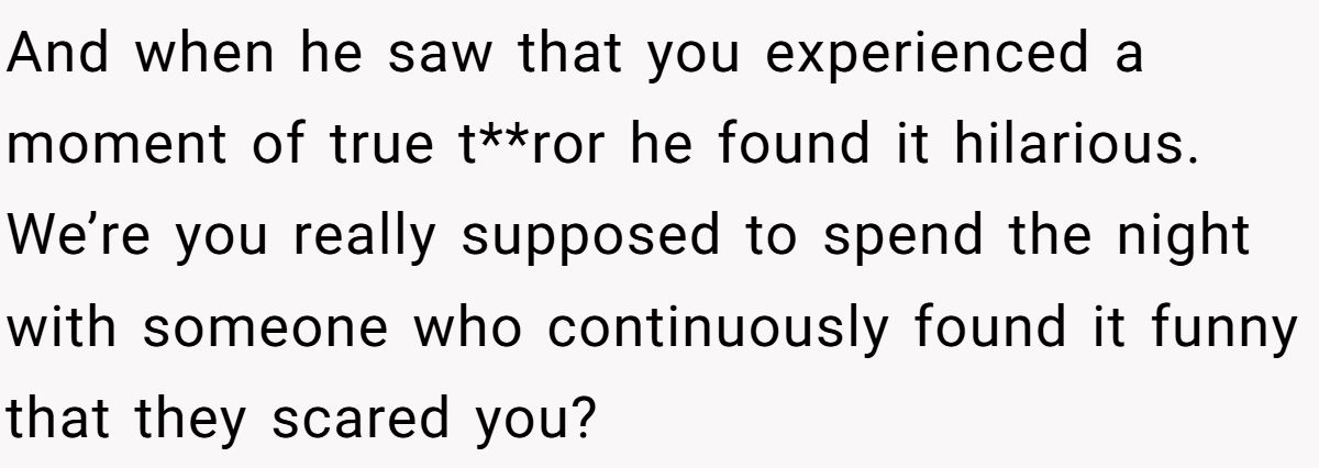 Her husband, grinning, tried to reassure her it was just him, that he’d only meant to surprise her. But instead of calming her down, his laughter felt like a slap. She could barely process the relief that she wasn’t being attacked because humiliation was already rising in her throat. She’d been genuinely terrified, and he was treating it like a harmless prank.