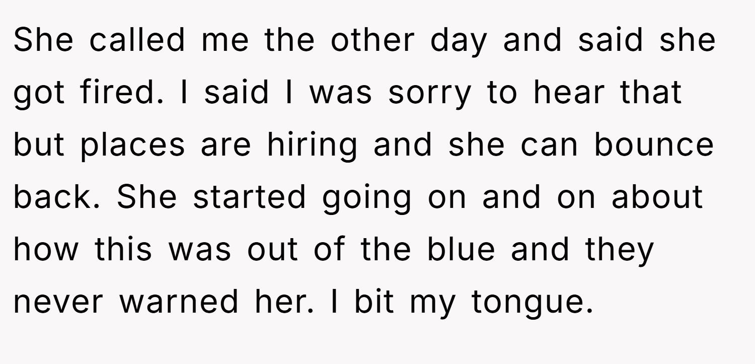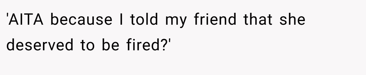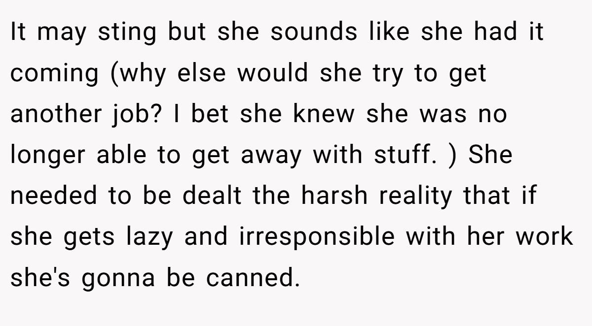 Several commenters rallied behind the original poster, saying the friend had it coming and needed to face the harsh reality that laziness and poor attitude at work eventually catch up — and getting fired might just be the lesson she needed.