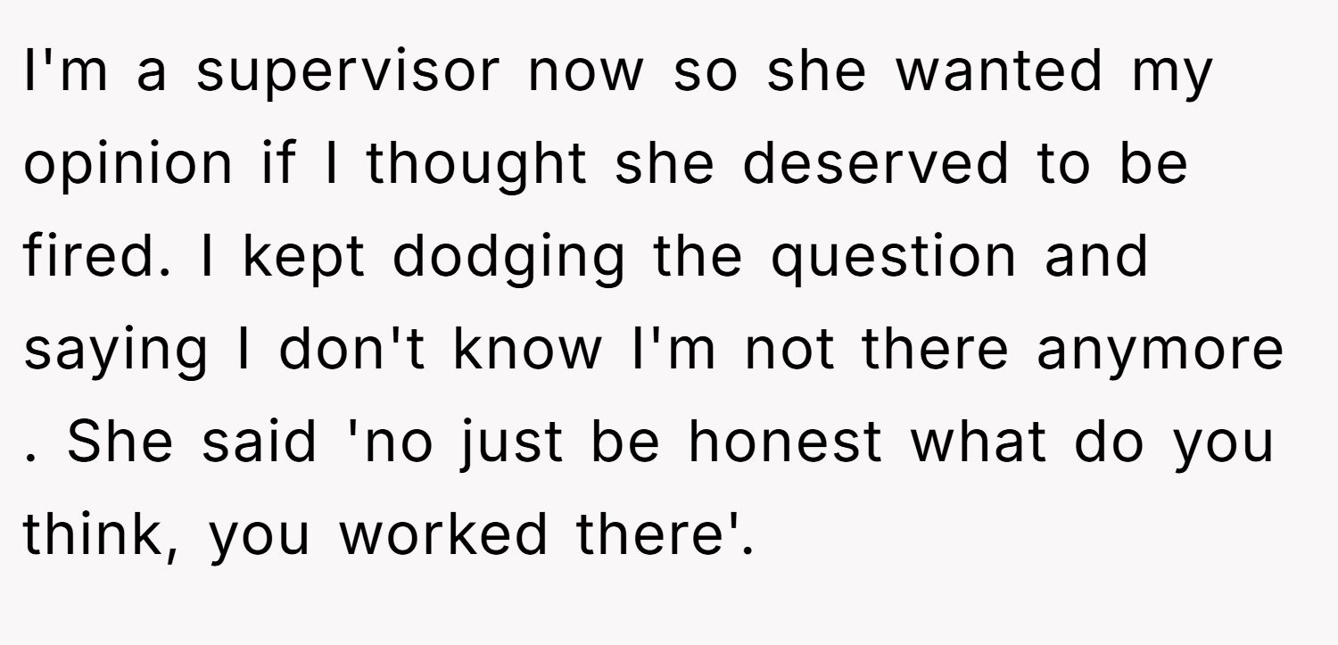 The Redditor, now in a supervisor role, had tried everything. Gentle talks. Private advice. Even covering for Tina more than once. But eventually, enough was enough. When Tina got fired and called up in shock, demanding to know if she deserved it… the Redditor didn’t hold back.