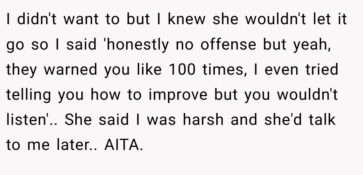 But deep down, she wasn’t surprised. Her friend had been late, careless, and ignoring warning after warning. When asked for the truth, she said it. Plain and honest. And that honesty? It broke something between them. Maybe for good.