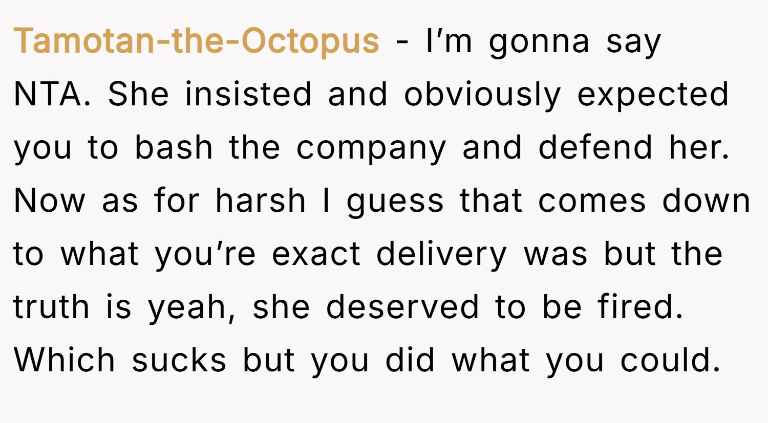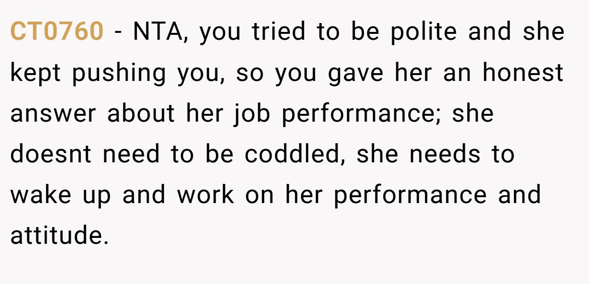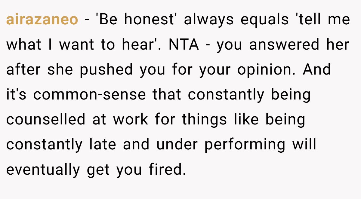 Airazaneo summed it up bluntly: “Be honest” usually just means “agree with me.” They argued the firing was basic cause and effect — show up late, slack off, get canned.