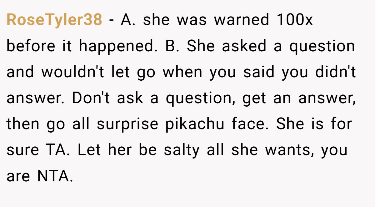 User Tb_bunni03 didn’t mince words, siding with the original poster for simply answering a question they were pressured to answer. In their view, the friend had a choice — take the truth and grow, or reject it and stay stuck. Charles Butler might say: honesty only stings when it hits a nerve.