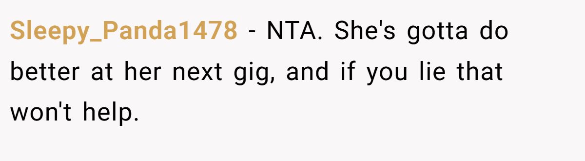 Sleepy_Panda1478 backed the truth, saying a lie wouldn’t help the friend do better in her next job — only honesty could. Charles Butler might call that tough love with purpose.