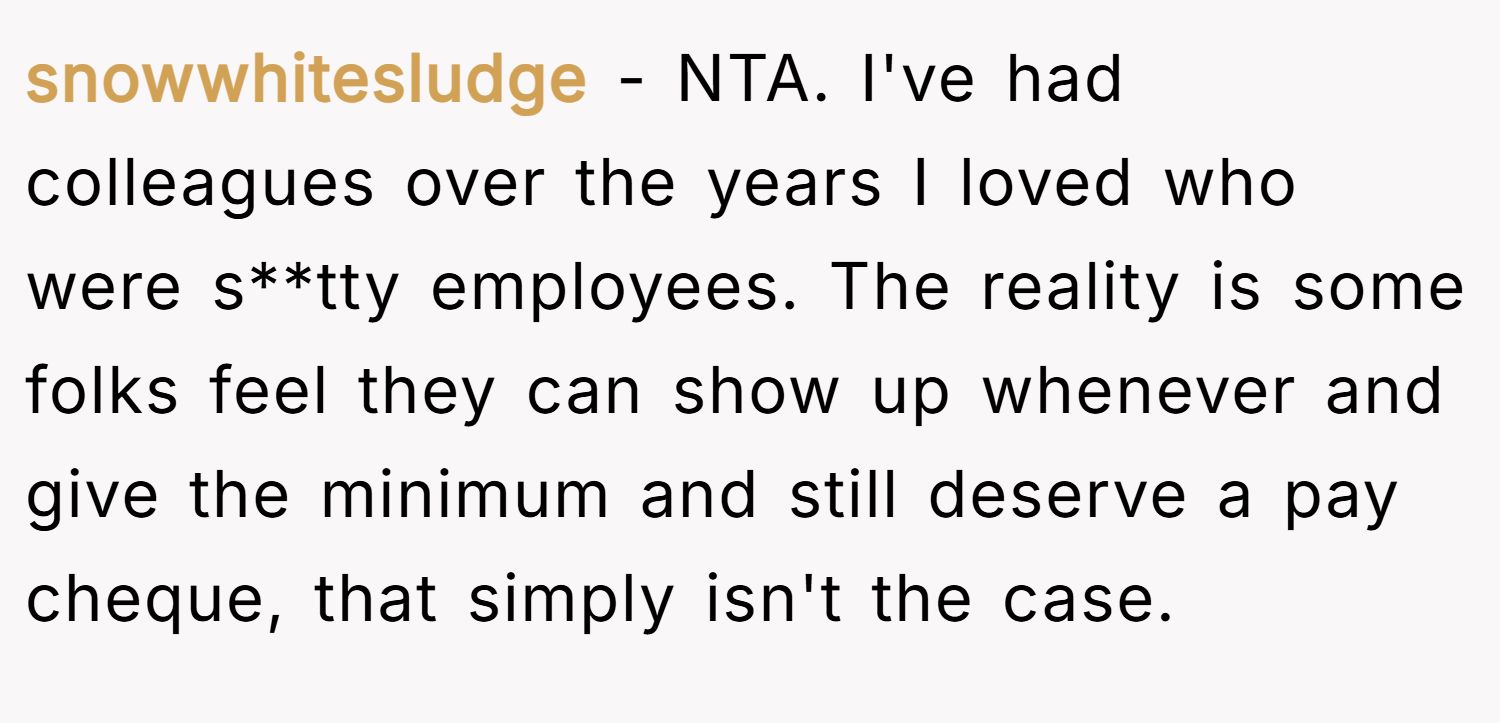 Snowwhitesludge made it clear: you can care about someone and still admit they’re a terrible employee. As Charles Butler might say, friendship doesn’t excuse professional free passes.