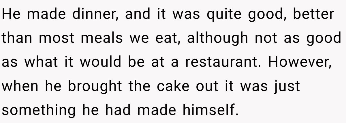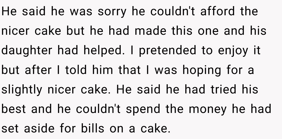 But when the day came, there was no fancy dessert box on the counter. Instead, Alex had tried to make it a homemade celebration, cooking dinner and baking a cake with his daughter. She could tell he was proud of their effort, and she tried to swallow her disappointment out of respect.
