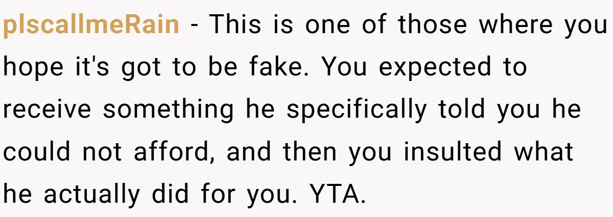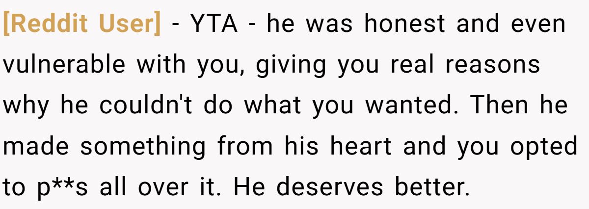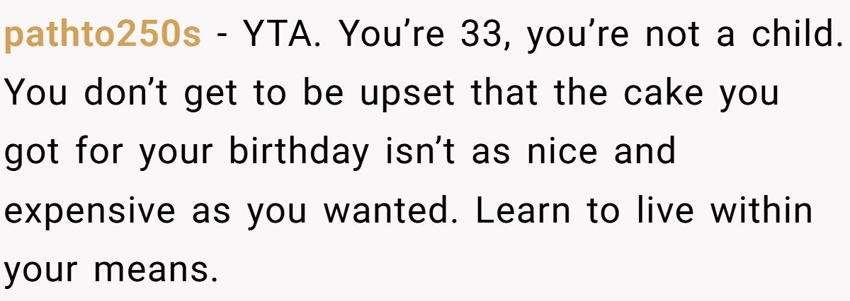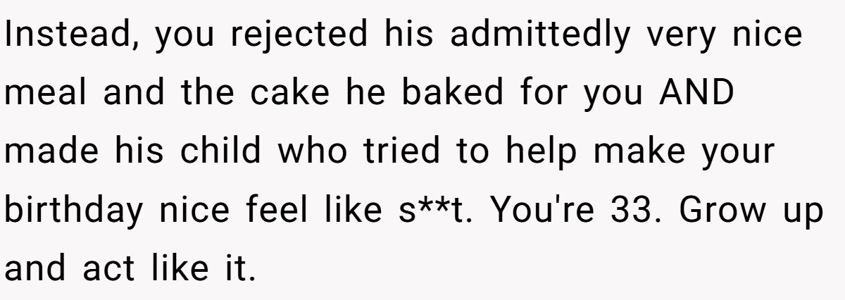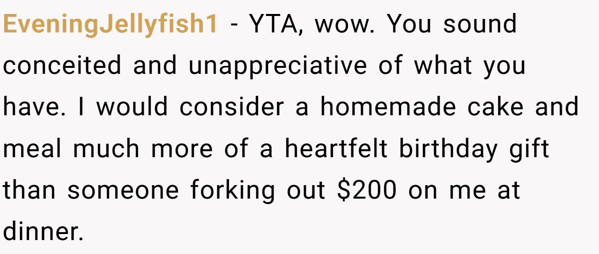 Most commenters agreed she was the problem, calling her ungrateful and immature for dismissing a heartfelt homemade celebration.