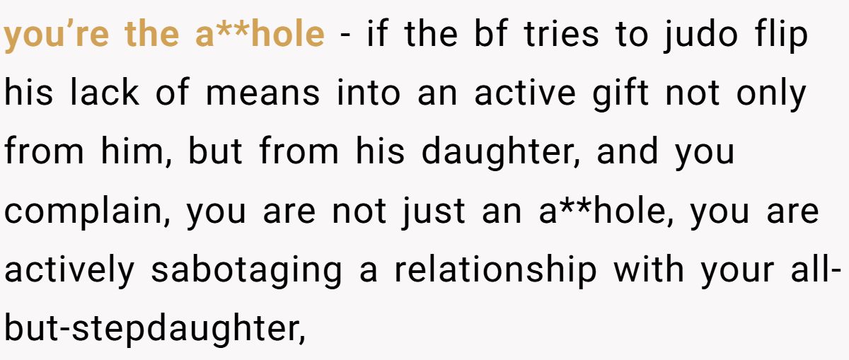 While others overwhelmingly called her the asshole, blasting her for being materialistic, ungrateful, and damaging her bond with her boyfriend’s child.