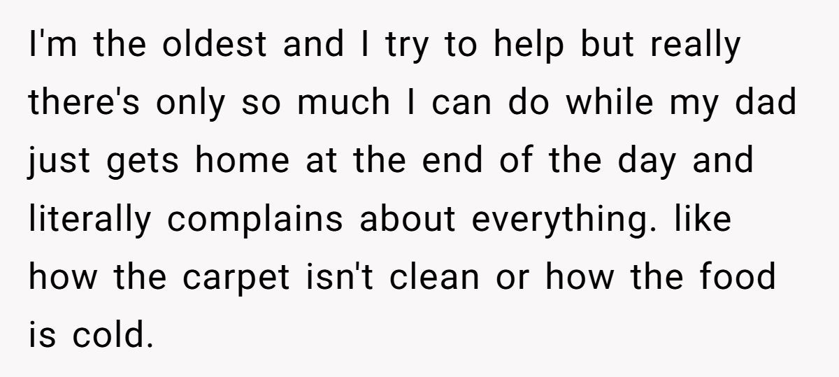 According to a 2023 study by the American Psychological Association, 68% of teens report household stress tied directly to parental conflict, often worsened when one parent devalues the other’s contributions. In this case, her mom was doing everything, meals, cleaning, emotional support, only to be met with critiques the minute her husband walked in the door.