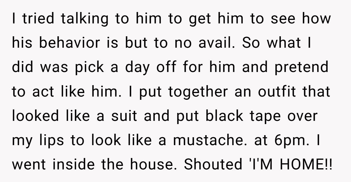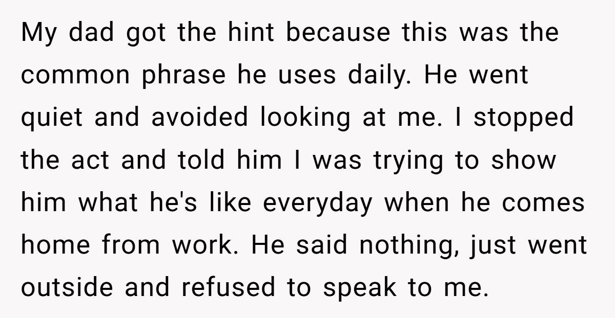 This teen mirrored their dad’s behavior after other methods failed and it finally hit home. He didn’t blow up, just went quiet, which might mean the message got through.