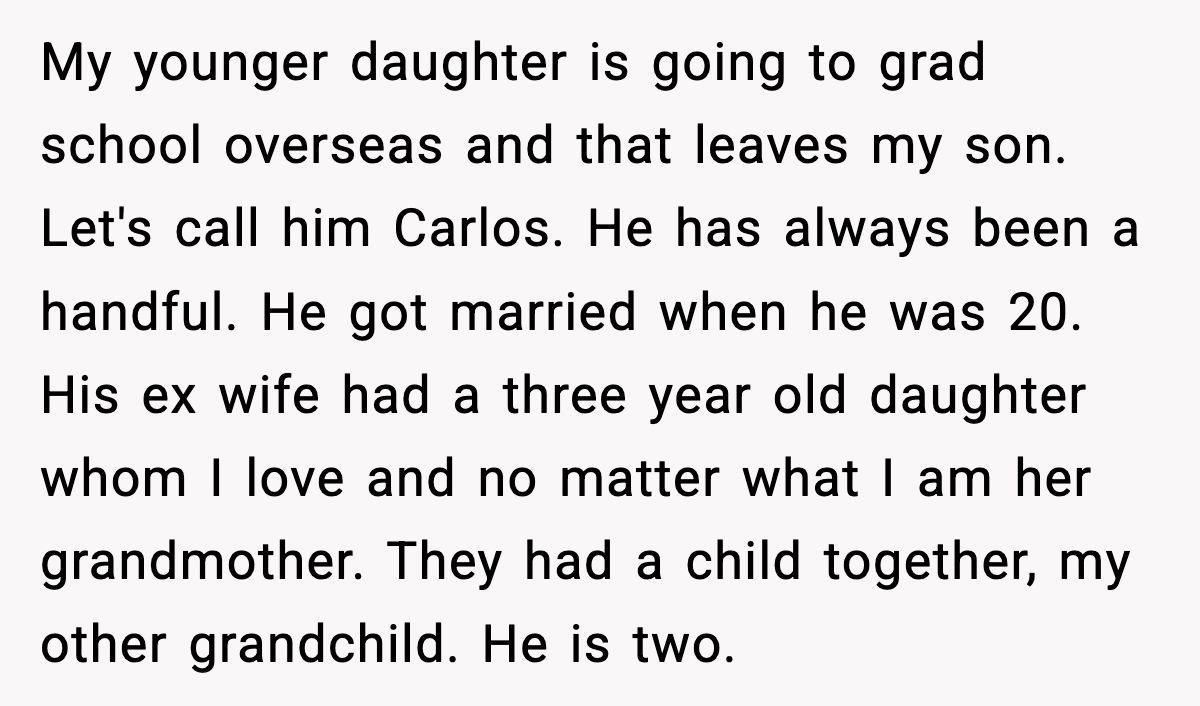 Her ultimatum—barring him from bringing the dog back—sets a firm boundary, showing tough love for a son spiraling in irresponsibility. She could encourage Carlos to focus on rebuilding his life, perhaps through counseling, while maintaining her bond with her grandkids. Was her call justified, or should she have consulted Carlos first? Readers, what’s your verdict?