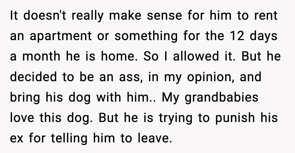 He barely walks it. Doesn’t brush it. Barely even sees it. And then, he leaves again—for weeks at a time—without any real plan. Not for the dog, not for his kids, not for himself.