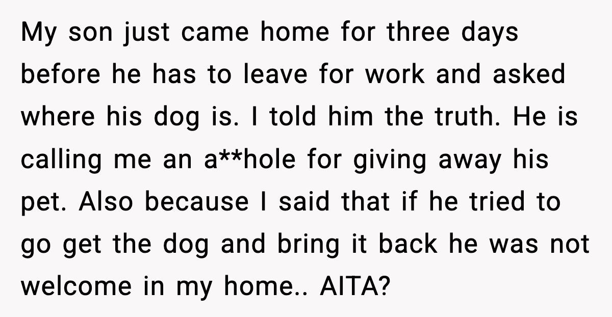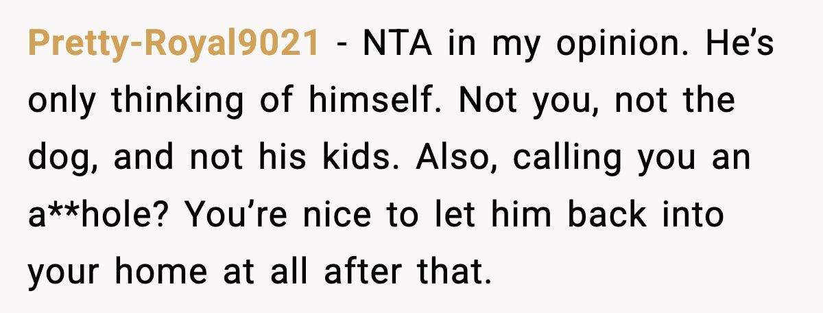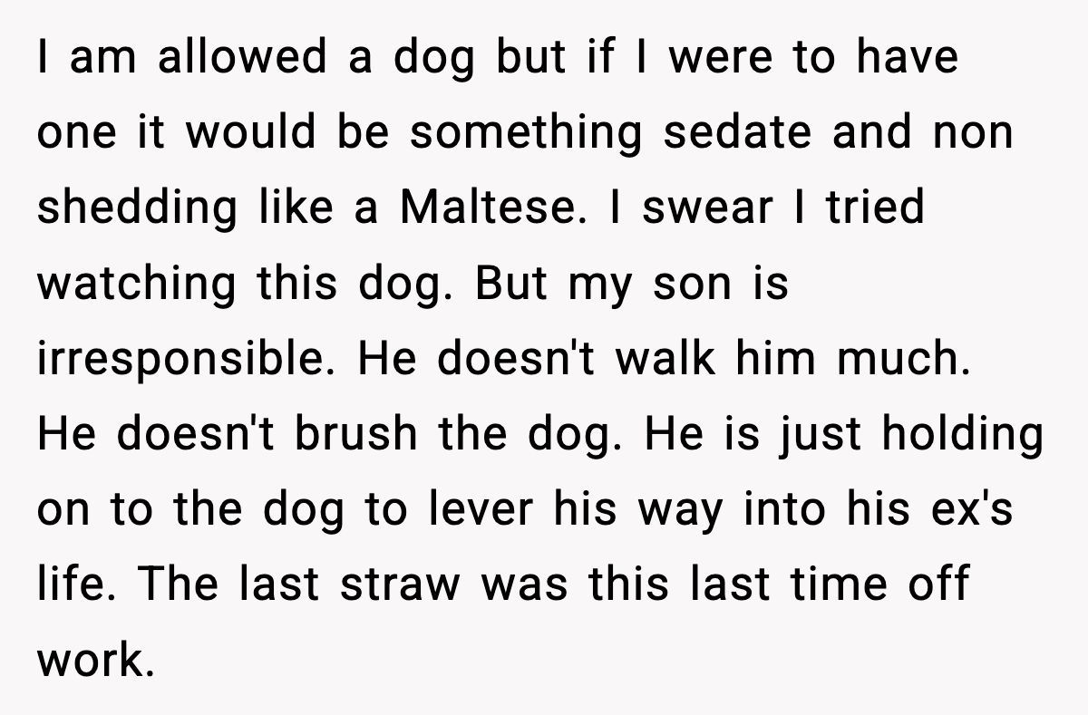 Carlos might argue it was his dog, and giving it away was a betrayal. Pets are personal, and he could feel his mom overstepped. But his neglect—skipping walks, ignoring grooming, and jetting off for a vacation—shows he cared more about control than the dog’s well-being. His ex-wife’s joyful tears and the kids’ excitement prove the pup was better off with them.