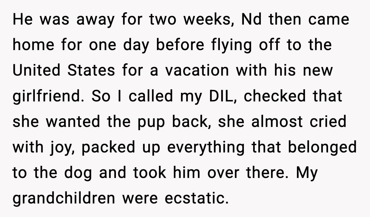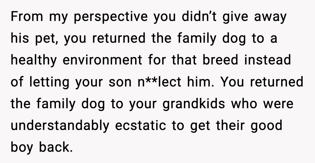 So Grandma did what she felt was right: she gave the dog back to the people who actually loved it. The ones with the yard, the trails, and most importantly, the emotional bond—the ex-wife and grandkids. Her son? Furious. Reddit? Applauding her.