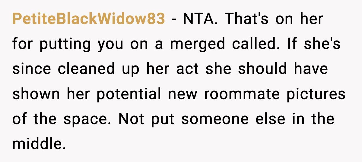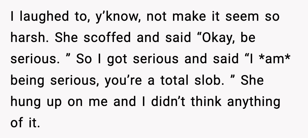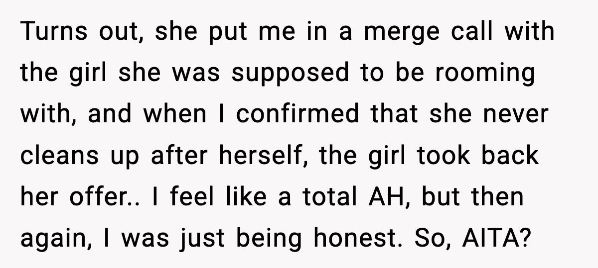 In this case, being dropped into a joint call—without notice—prompted a response that was technically truthful, but socially disastrous. Emily, author at DormTherapy.com, recommends “setting ground rules early to avoid cleaning tensions,” which would’ve helped prevent this bombshell moment.