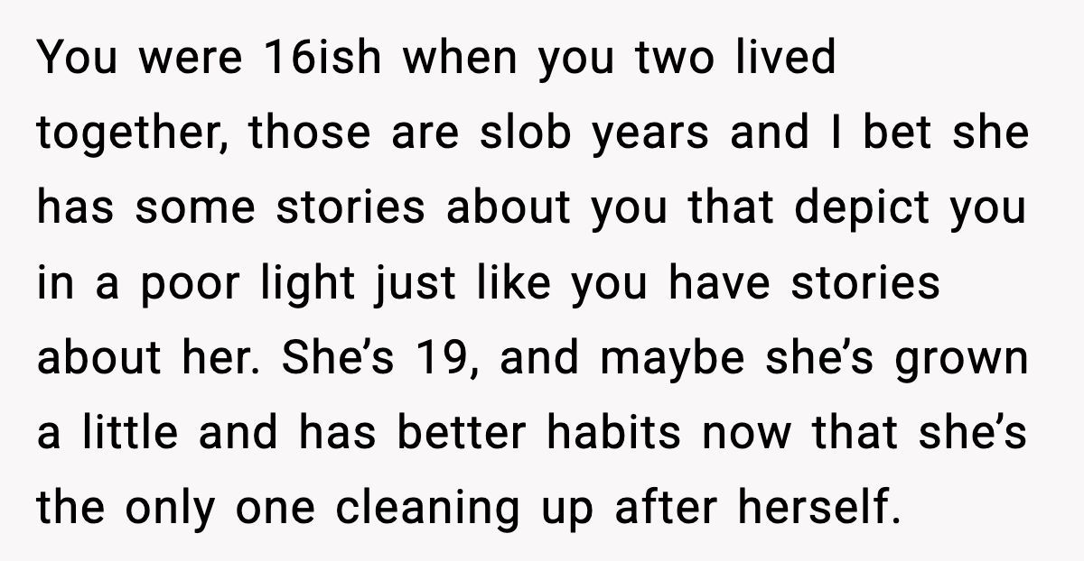 A commenter noted T’s lack of self-awareness about her messy habits caused the issue.