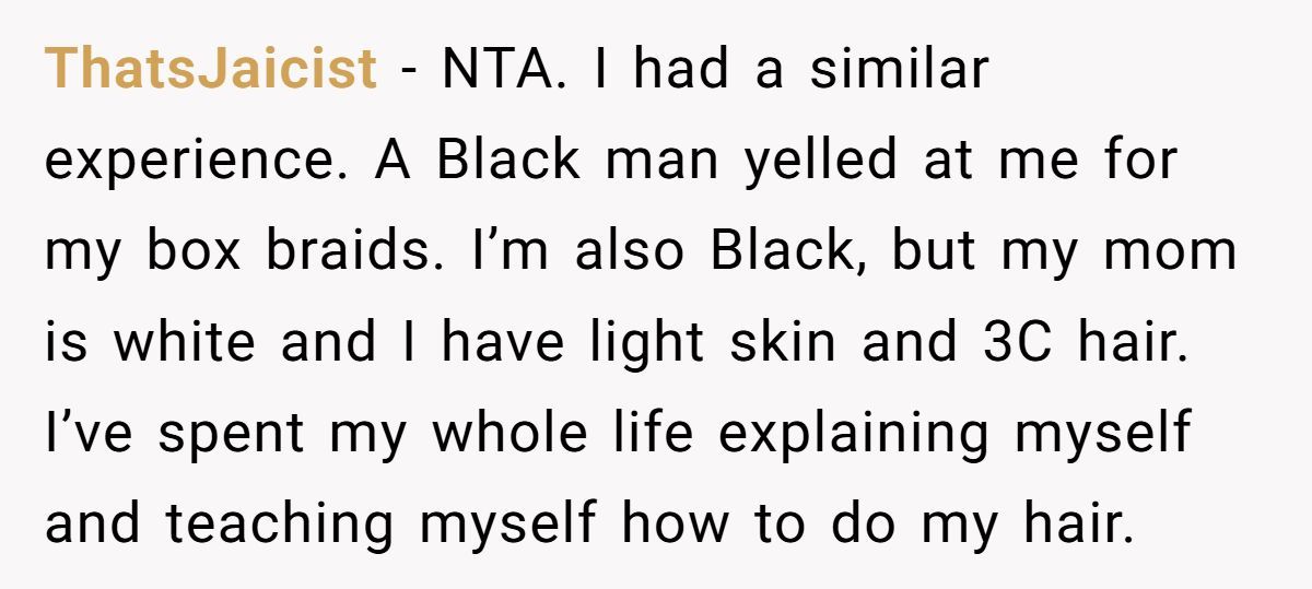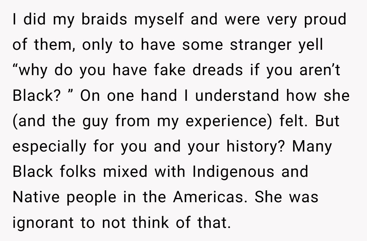 As a light-skinned woman of Black and Indigenous descent, she’s used to justifying her roots. But when a store employee accused her of “stealing culture” right to her face, the moment cracked her wide open. Instead of backing down, she asked for the manager—and now she’s wondering if she crossed a line.