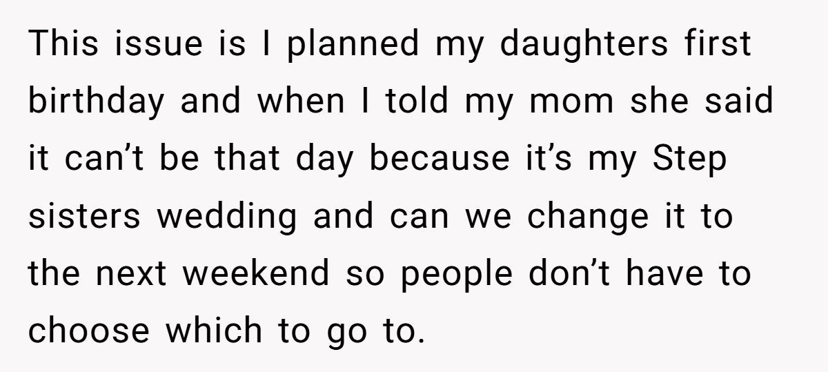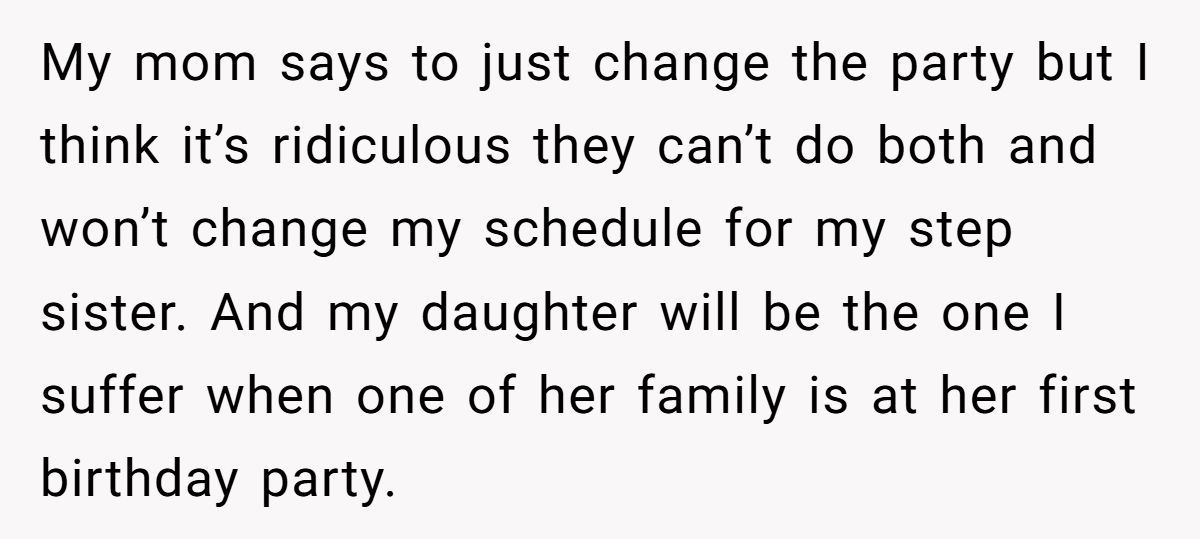 One woman shared a heated family conflict after scheduling her daughter’s first birthday party on the same day as her step-sister’s wedding, refusing to budge despite family pressure