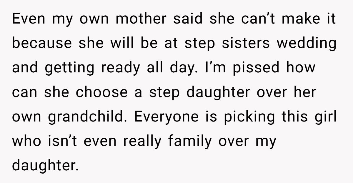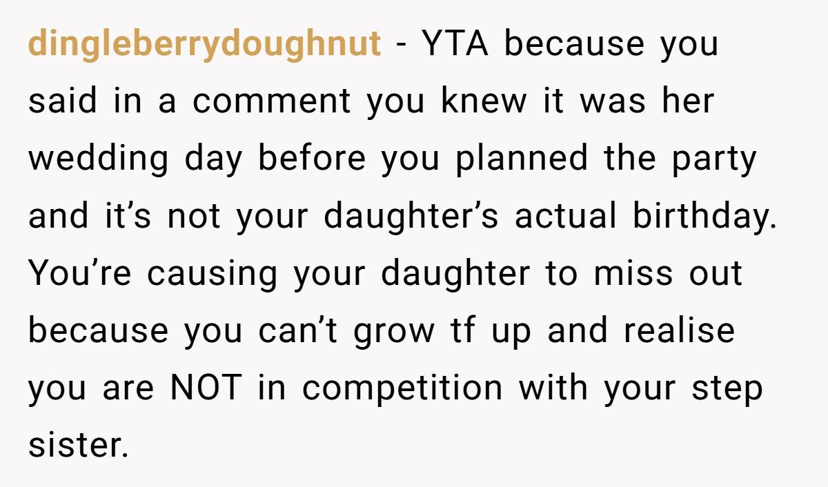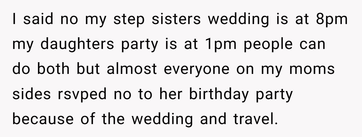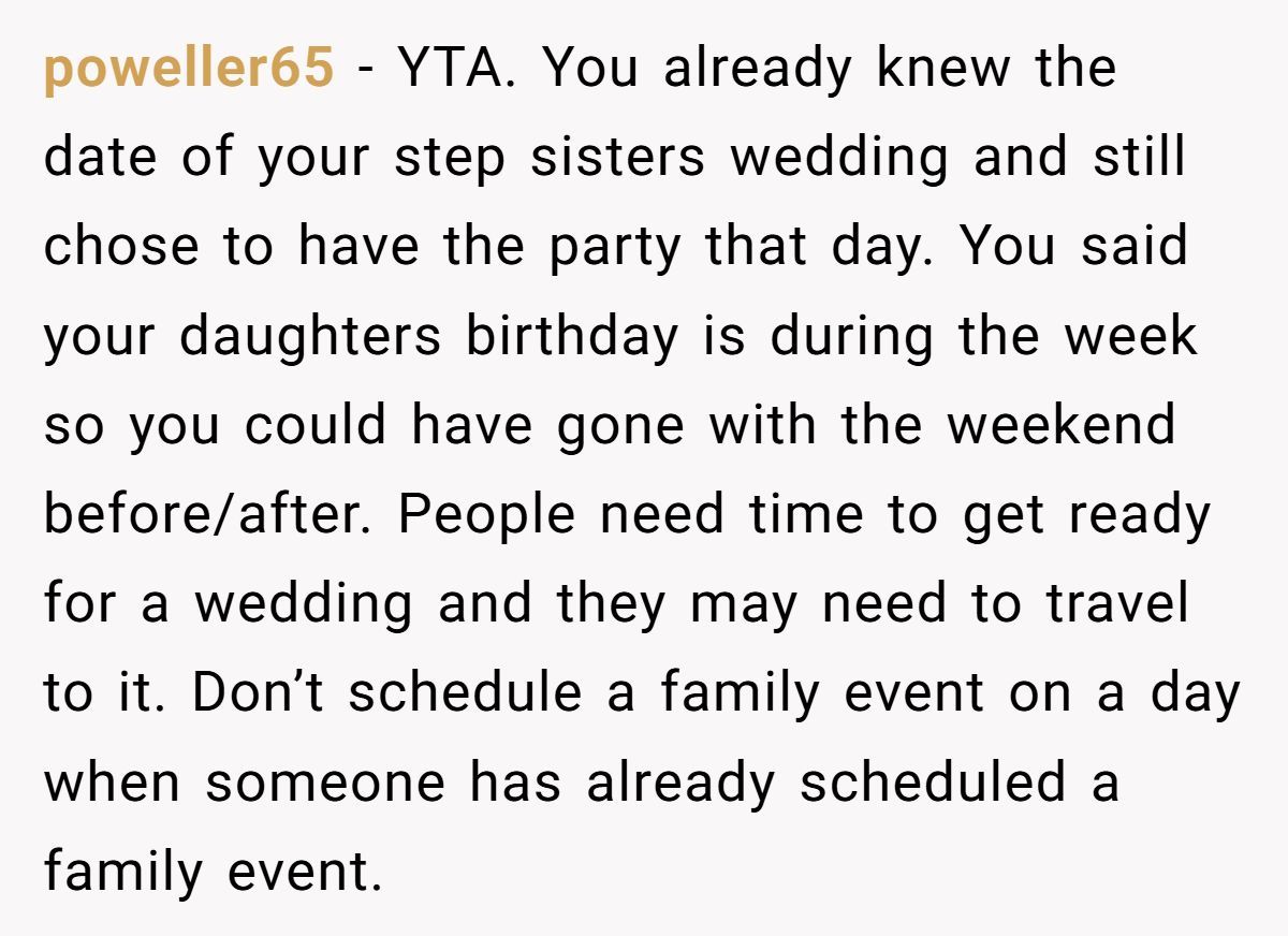 At the heart of this story is a woman who never accepted her step-sister, resented their mother’s affection for her, and now finds herself lashing out when that bond still holds strong. She chose to schedule a birthday party—on a date she already knew was taken by her step-sister’s wedding—and is now upset the family isn’t scrambling to attend both. The Redditor insists her daughter is suffering. But experts suggest it’s her own bitterness doing the damage.