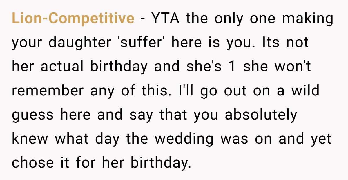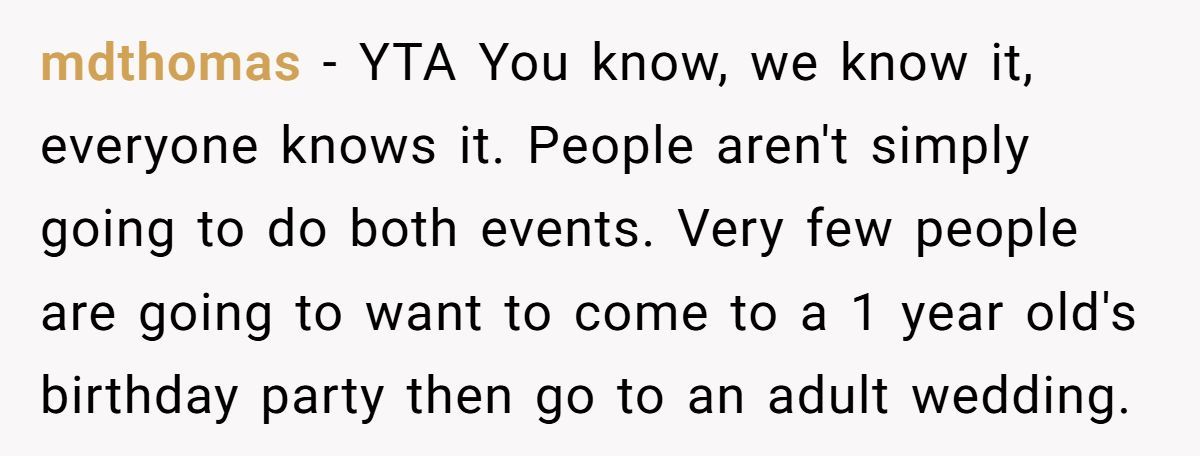 This tale of birthday versus bridal aisle highlights how unresolved family tensions can bubble over when no one’s willing to let go. The daughter might be just one year old, but the real growing up needed here isn’t hers.