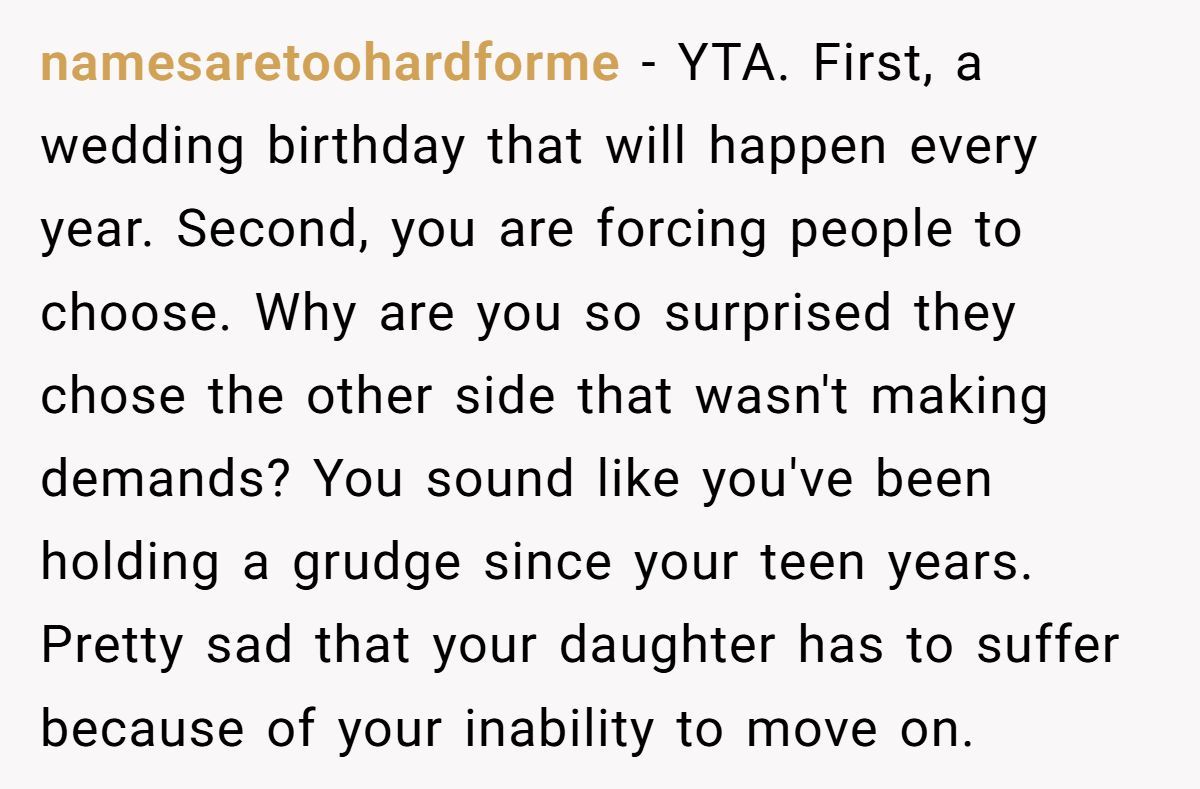 Instead of using her daughter’s birthday as emotional currency, the Redditor might have asked herself: What’s more important—holding onto resentment or modeling emotional maturity for the next generation?