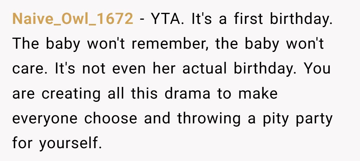 These Reddit users emphasized the child’s lack of awareness, arguing the party’s timing only serves the Redditor’s agenda