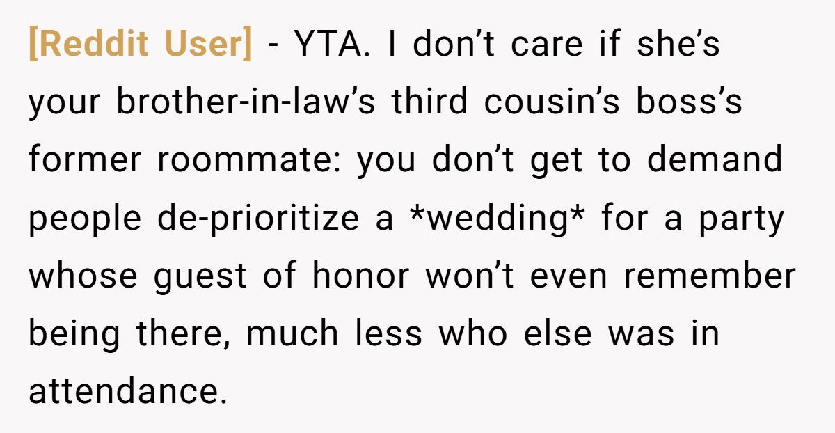 Do you think the mom was justified in feeling snubbed—or did she orchestrate her own disappointment? Would you have changed the party plans or stuck to your guns? Drop your take in the comments—just keep the wedding drama to a minimum.