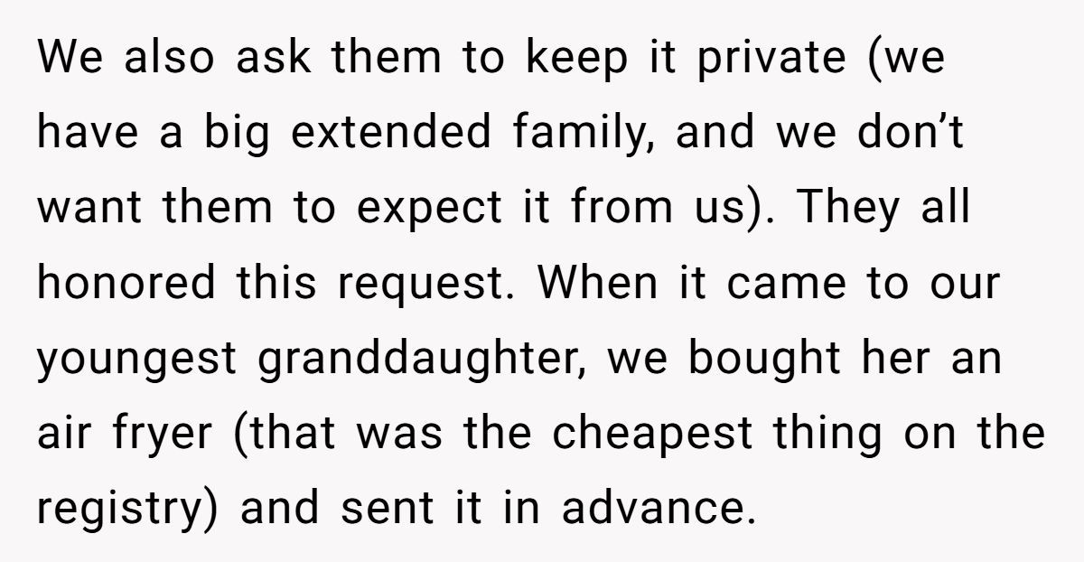 That’s exactly what happened when a grandmother (in her 70s) followed her quiet family tradition—gift small off the registry, then hand over a private check worth tens of thousands. But when the last grandchild decided a $100 air fryer wasn’t enough and lashed out before the big day, the grandparents had second thoughts. One year later, the family’s in meltdown mode.