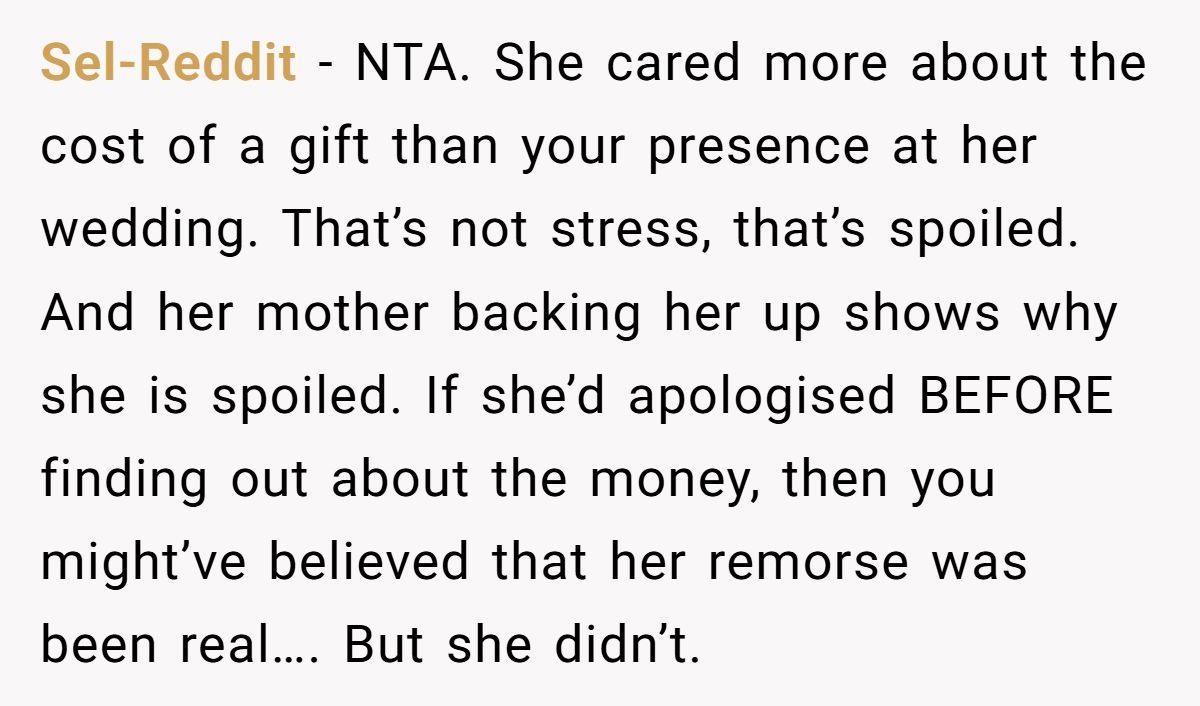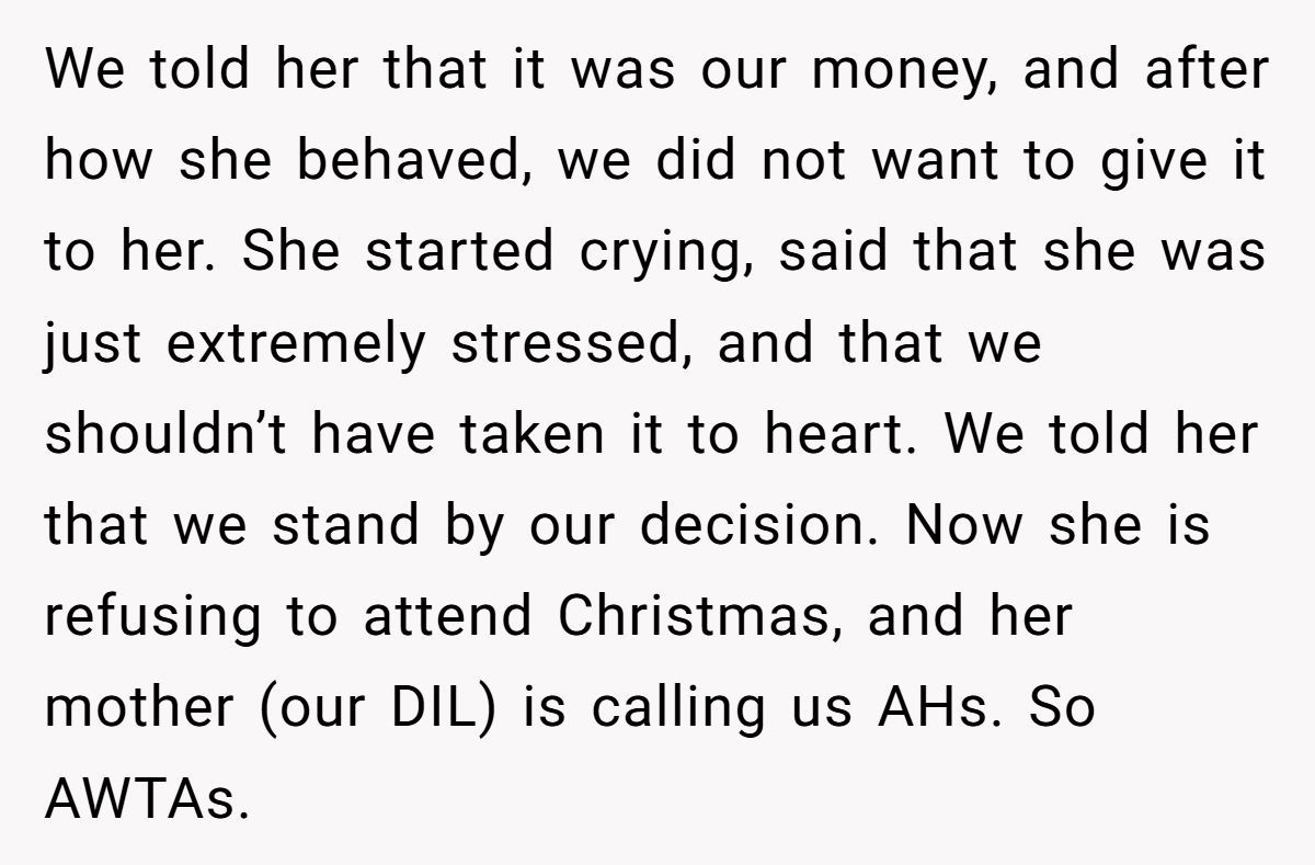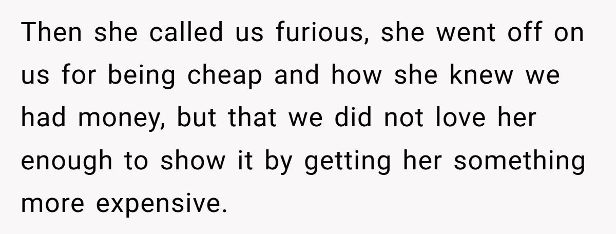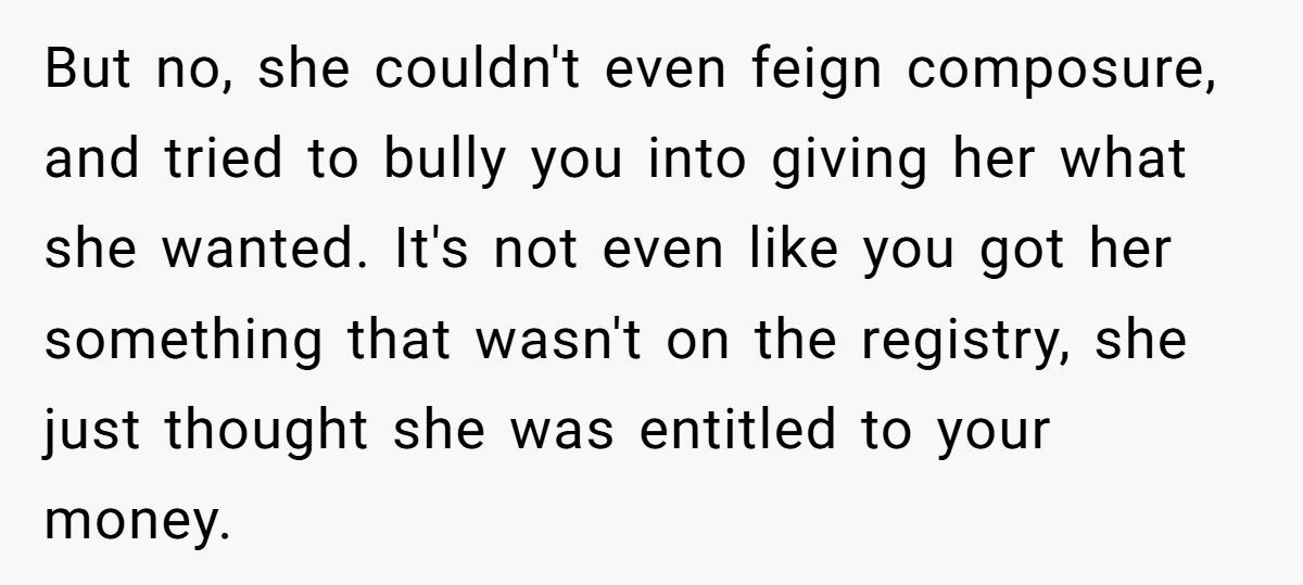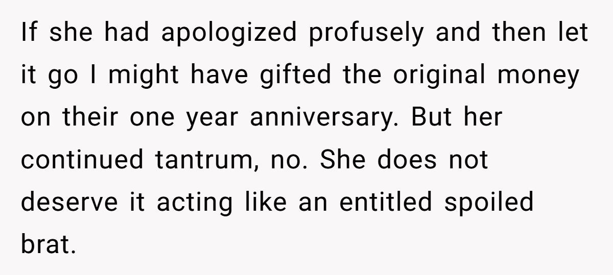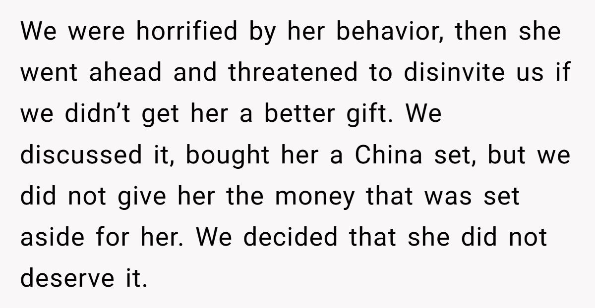 Her behavior—demanding a pricier gift and dismissing their presence—showed a lack of respect, especially since they even upgraded to a China set to appease her. Her tears and “stress” excuse only surfaced after learning about the cash gifts, revealing her regret was more about the money than their relationship.