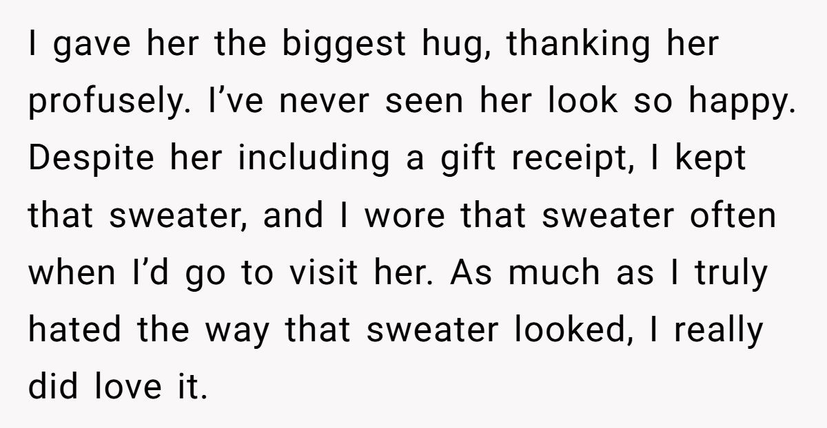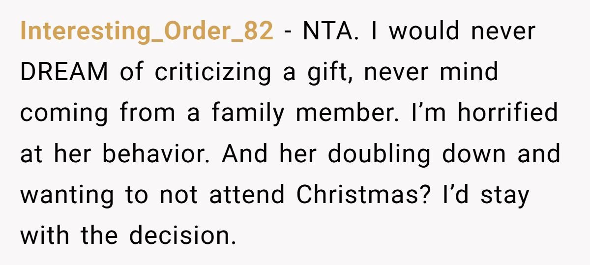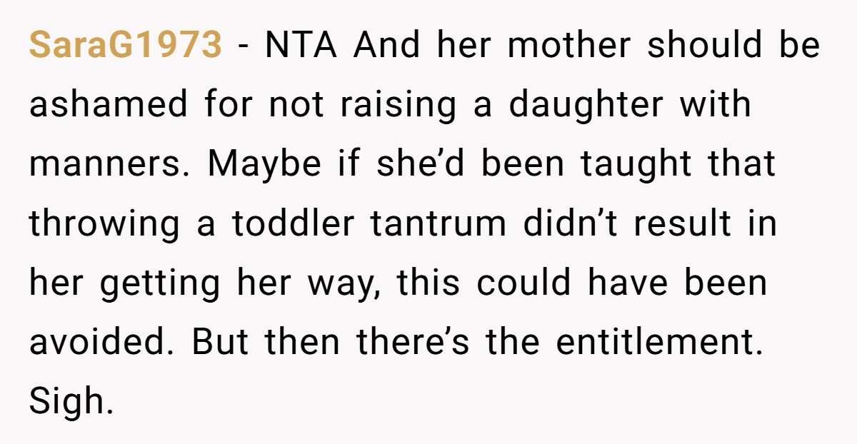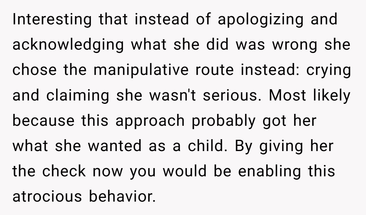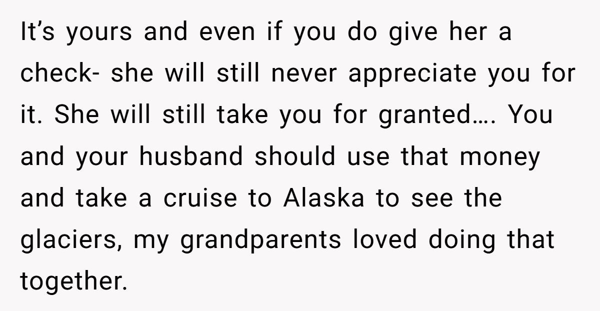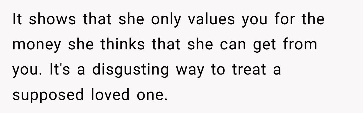 Her behavior—demanding a pricier gift and dismissing their presence—showed a lack of respect, especially since they even upgraded to a China set to appease her. Her tears and “stress” excuse only surfaced after learning about the cash gifts, revealing her regret was more about the money than their relationship.