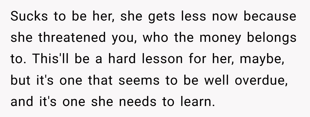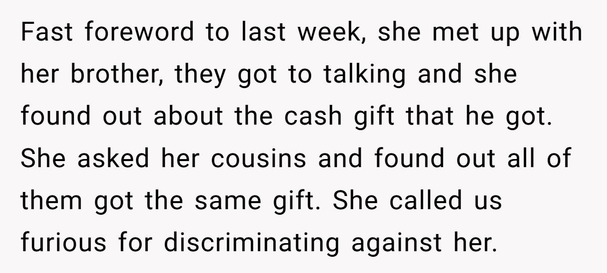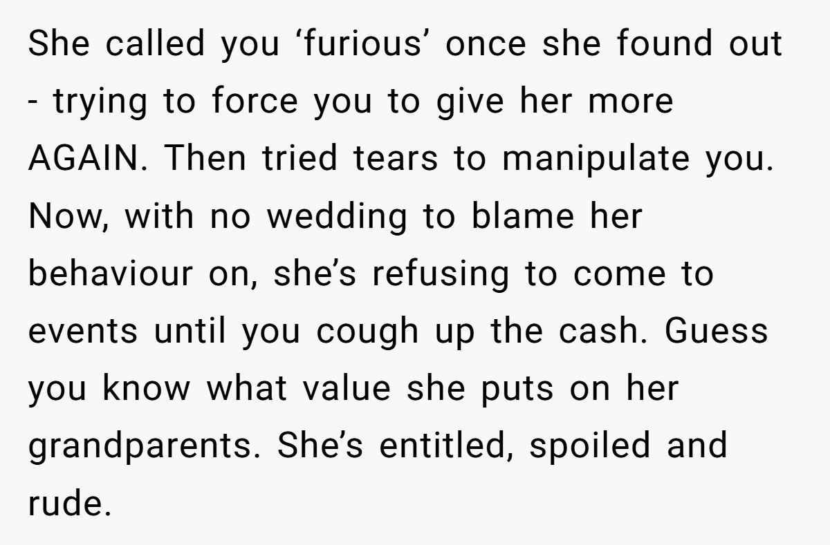 The granddaughter’s assumption that her grandparents’ wealth entitled her to more, coupled with her failure to apologize until caught out, justifies their decision. Their request for secrecy about the cash gifts shows their intent to avoid family pressure, making her public tantrum and subsequent digging with cousins even more disrespectful.