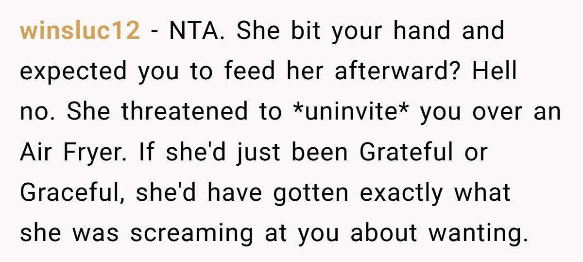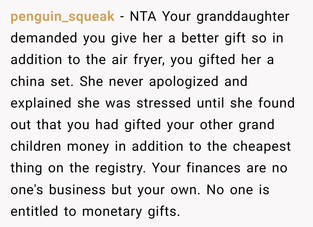This Redditor and her husband, both in their 70s, were justified in withholding a $40,000 wedding gift from their youngest granddaughter after her entitled outburst over an air fryer and threats to disinvite them from her wedding.