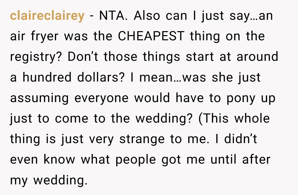 A Redditor just dropped a jaw-dropping tale that’s part Hallmark, part cautionary tale, and a little bit karma. Imagine saving up a secret $40,000 surprise wedding gift for each grandchild—only to have one of them call you “cheap” and threaten to disinvite you from the wedding over an air fryer.