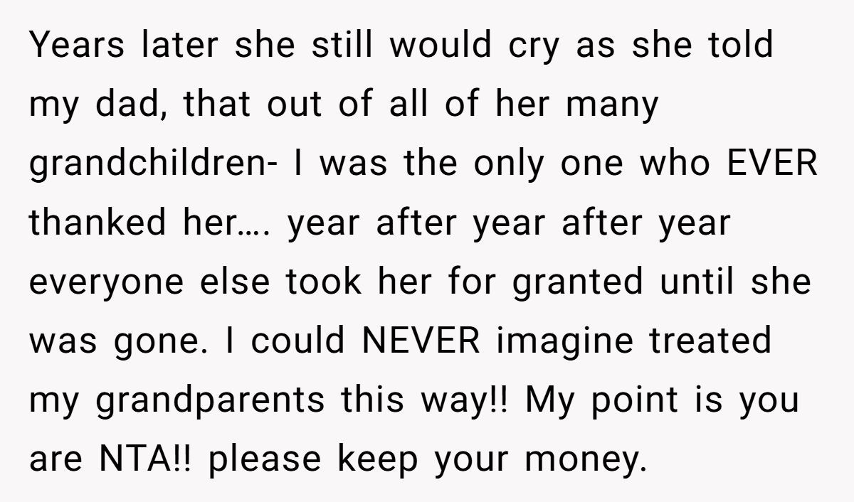This user highlighted the importance of gratitude, contrasting the granddaughter’s behavior with heartfelt stories