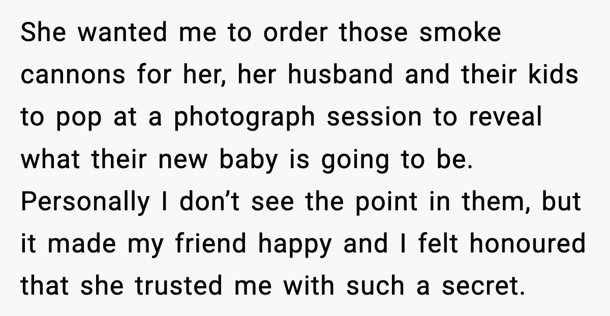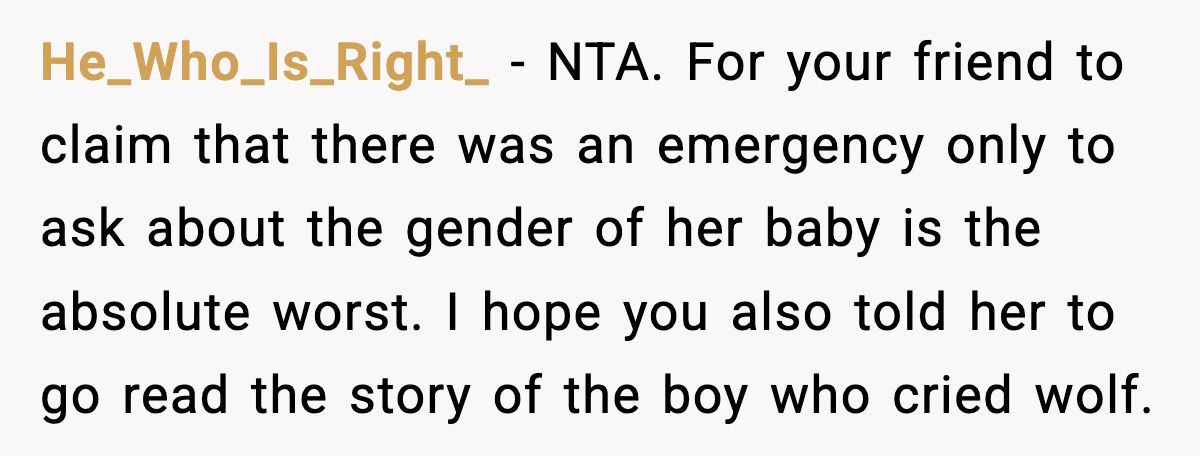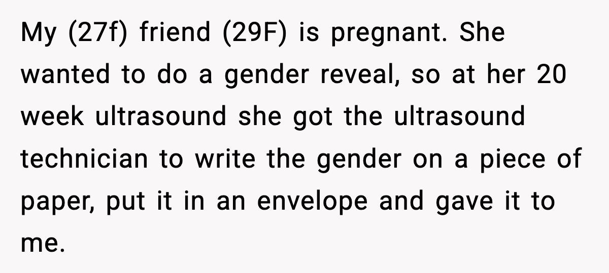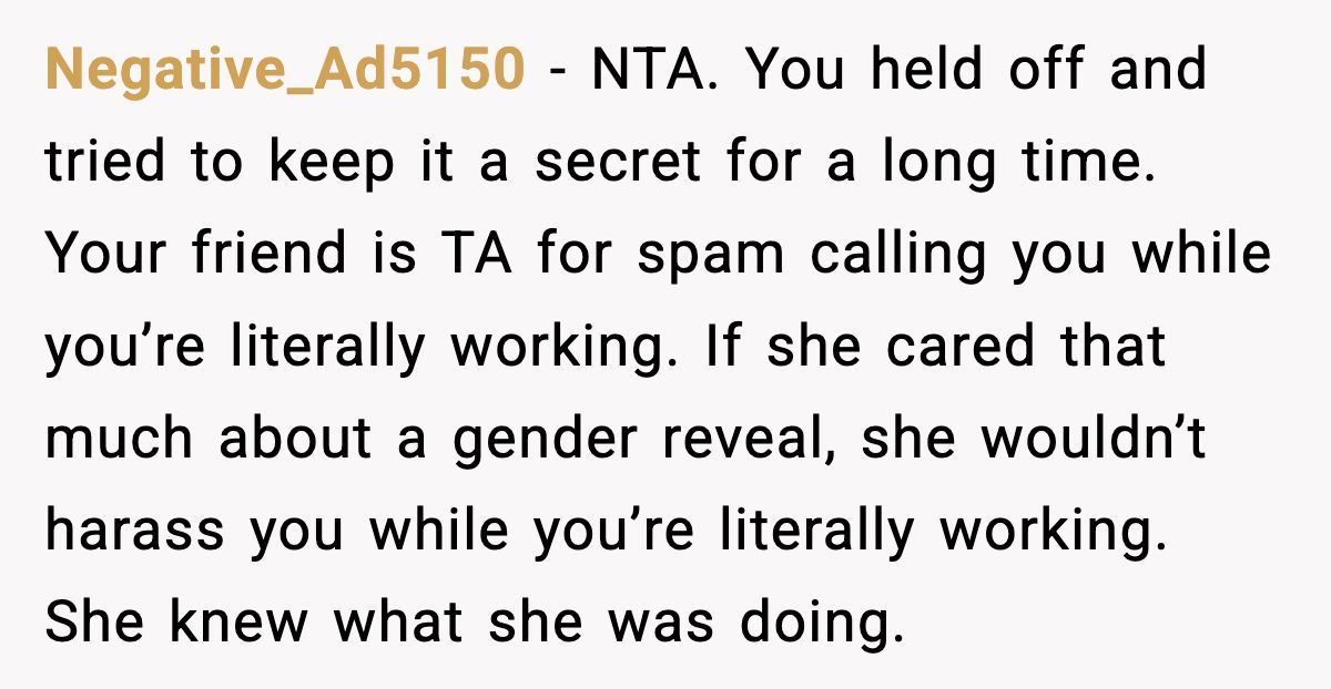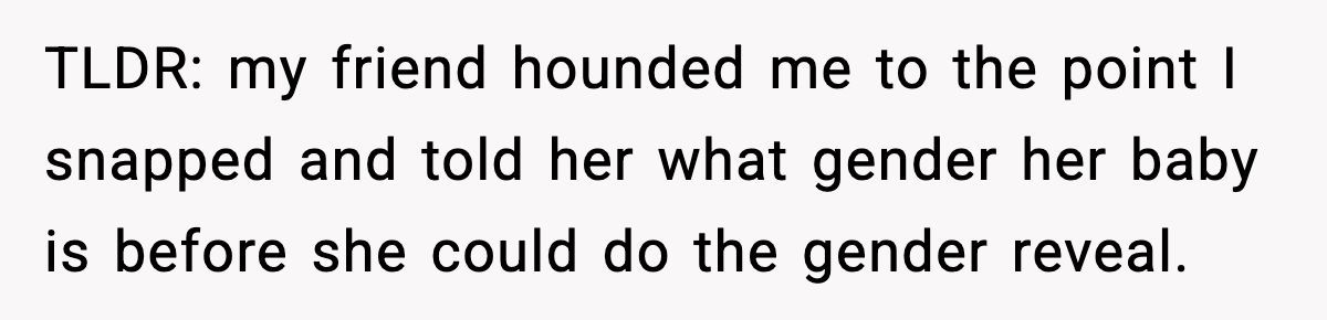 The friend might argue the Redditor betrayed her trust, ruining a special moment she’d planned for weeks. Gender reveals are deeply personal, and the friend’s excitement doesn’t excuse the Redditor’s slip. But her relentless hounding—especially interrupting work with a false emergency—crossed a major line. Expecting the Redditor to stay silent under that pressure, after explicitly begging her not to spill, was a setup for failure.