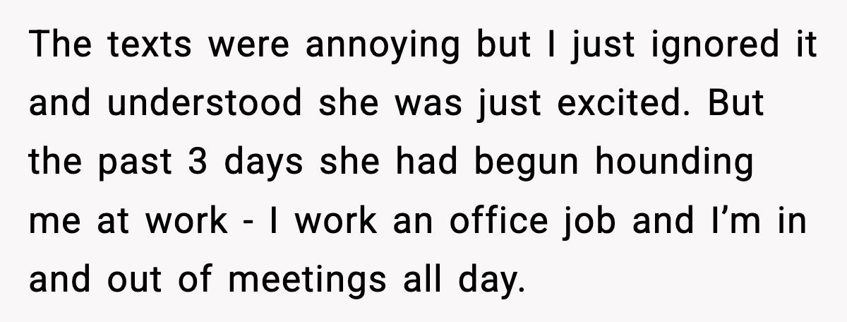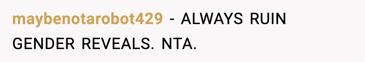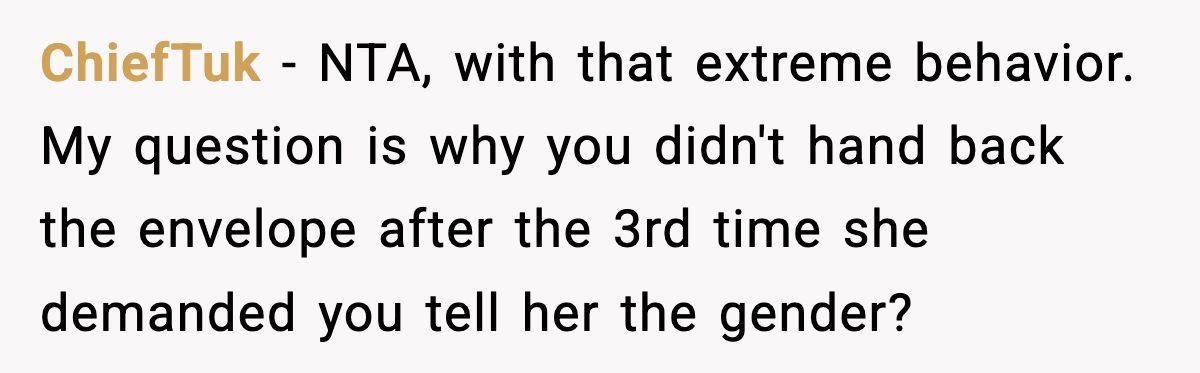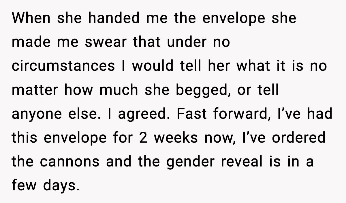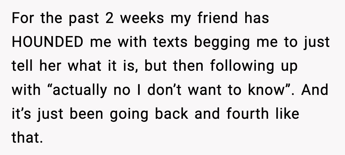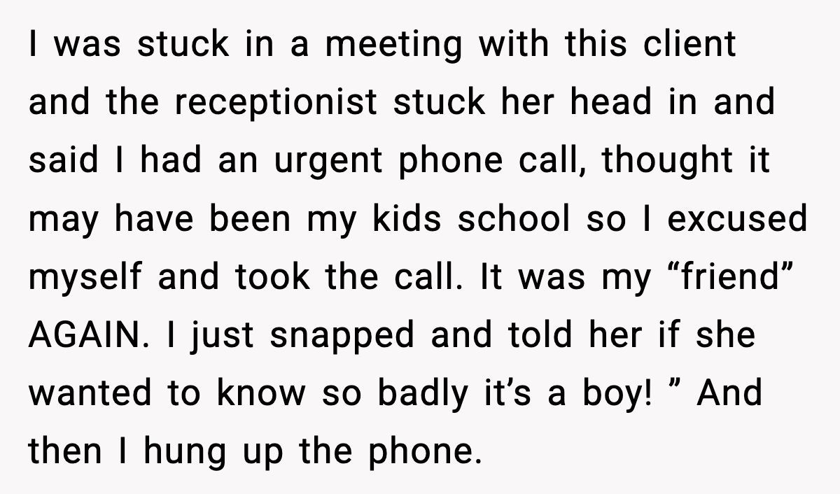 The friend might argue the Redditor betrayed her trust, ruining a special moment she’d planned for weeks. Gender reveals are deeply personal, and the friend’s excitement doesn’t excuse the Redditor’s slip. But her relentless hounding—especially interrupting work with a false emergency—crossed a major line. Expecting the Redditor to stay silent under that pressure, after explicitly begging her not to spill, was a setup for failure.