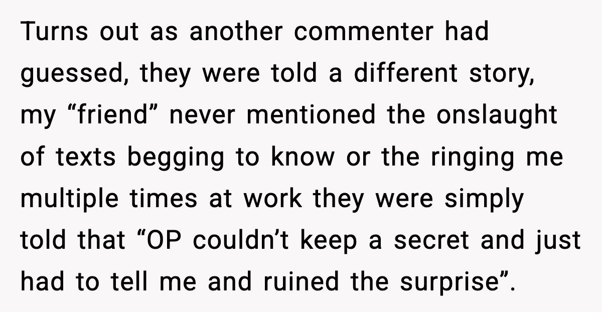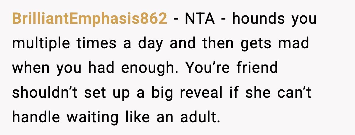 The friend’s incessant hounding and failure to respect boundaries caused her own reveal ruin, not the Redditor’s slip