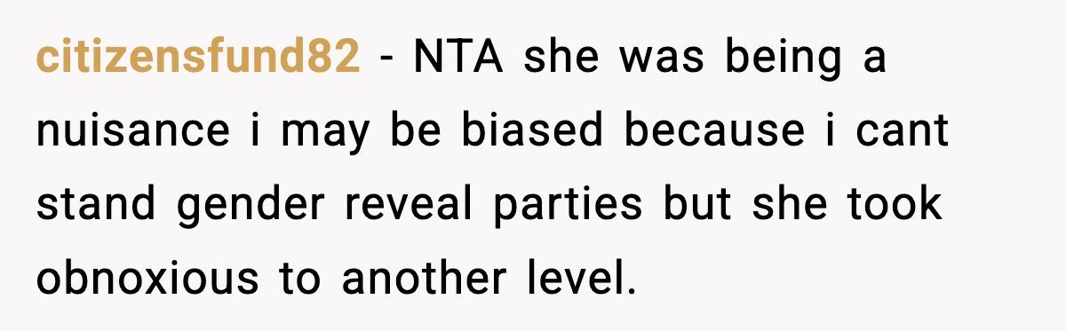 In the end, a puff of blue powder wasn’t the only thing revealed that day. A friendship’s cracks came into full view—between broken promises, blurred boundaries, and a baby-sized mountain of drama. Was the Redditor wrong to spill the beans after being harassed for weeks, or did her friend’s obsession cross the line first?