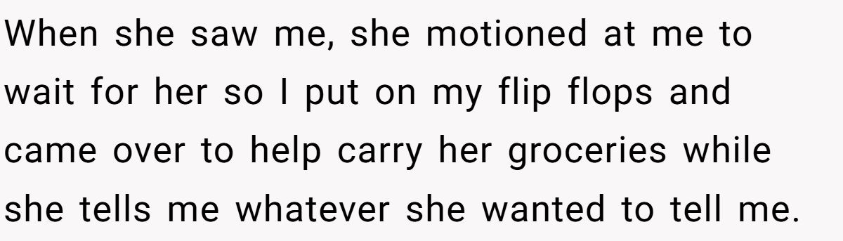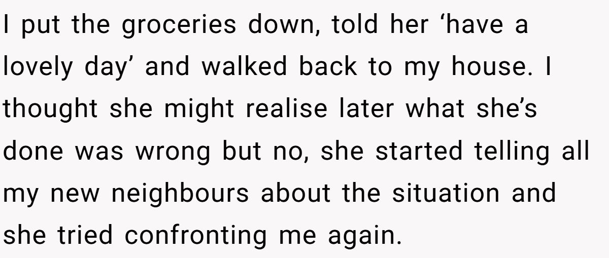 The Redditor tried to stay calm. She even helped carry Leah’s groceries inside. But when Leah returned for Round Two, determined to gossip and stir up drama, the Redditor’s patience cracked.