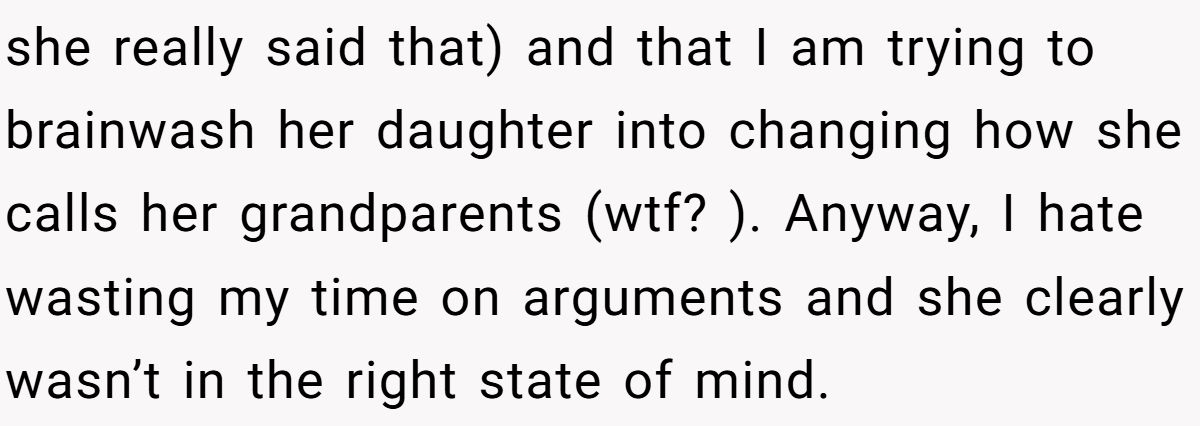 She could try a neutral reset with a simple “let’s agree to disagree” or a note explaining the cultural context. But she’s also within her rights to set a clear boundary: no more lectures about her child’s identity.