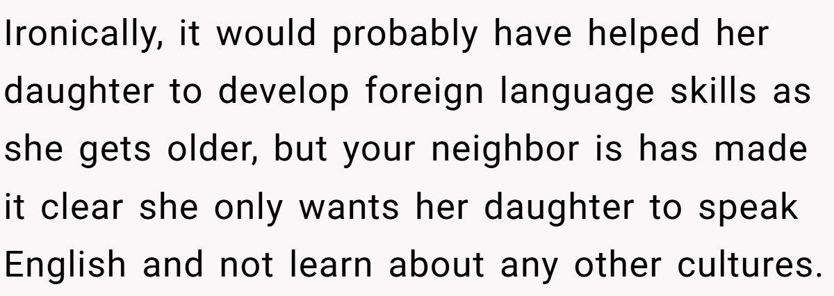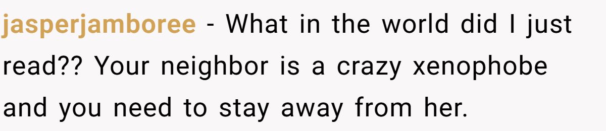 Commenters rallied behind the parent, calling the neighbor’s reaction xenophobic and highlighting the ignorance behind her outrage.