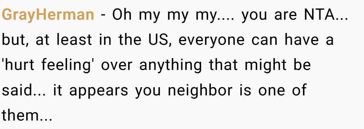 Most replies backed the parent, saying the neighbor’s outrage was overblown and rooted in prejudice more than genuine offense.