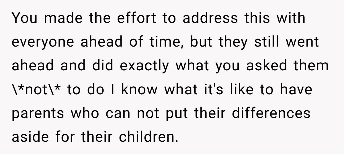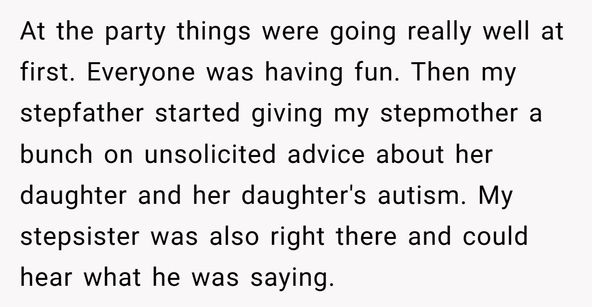 The Redditor, who had asked for one drama-free day, found their request ignored. At their graduation party, meant to celebrate years of hard work, their stepfather decided it was the perfect time to give parenting advice—specifically about their stepmother’s autistic daughter. What followed was an explosive argument between the two adults that hijacked the event and left the graduate simmering with anger.
