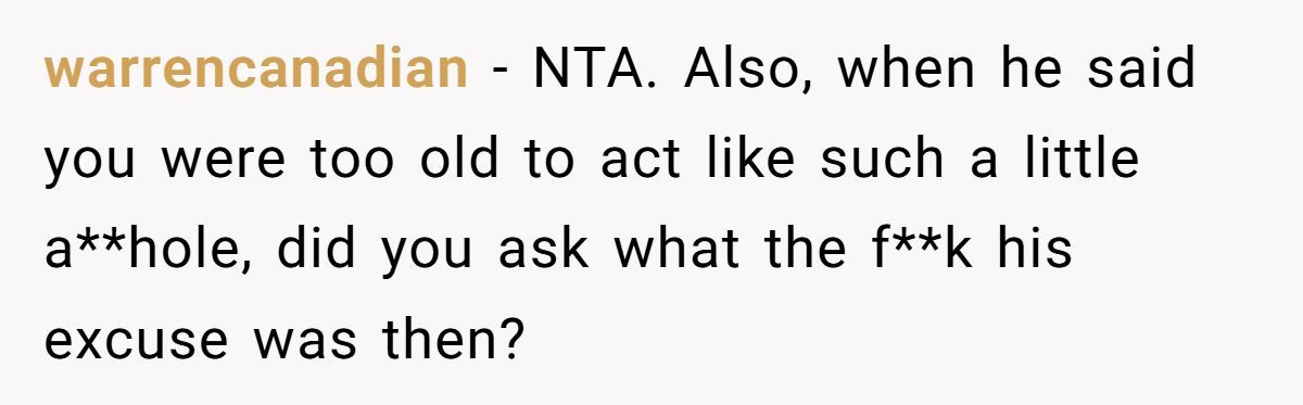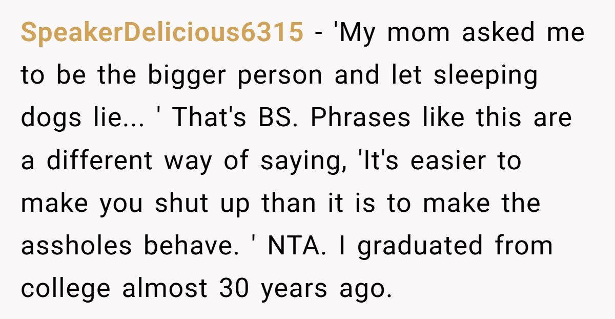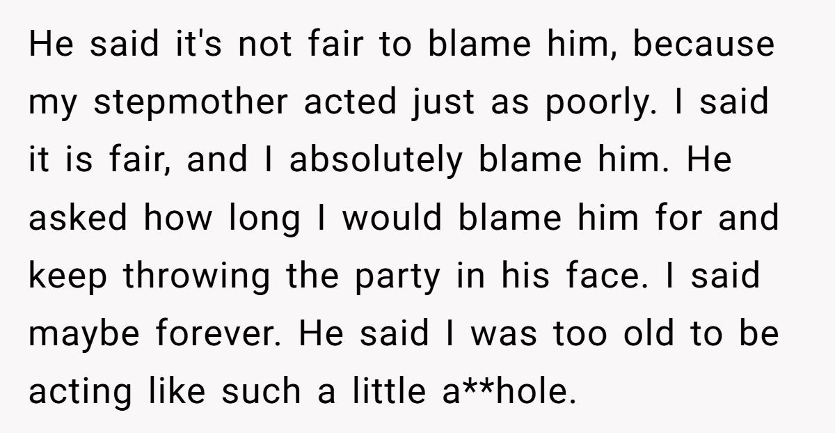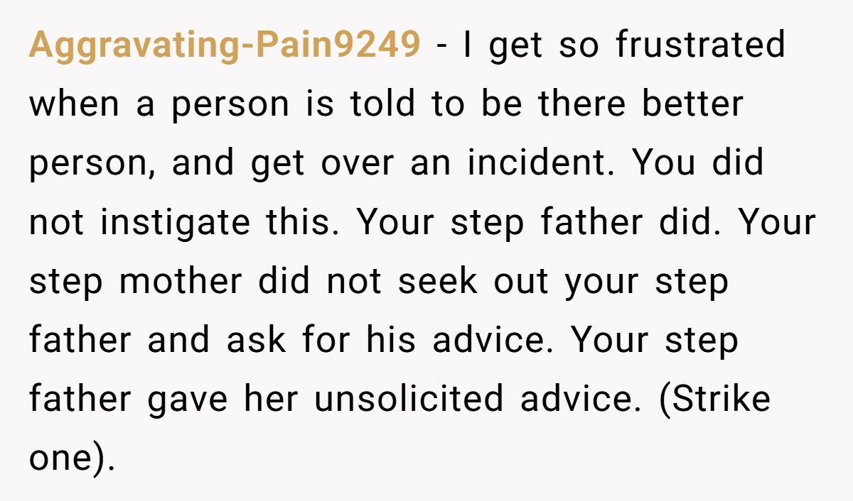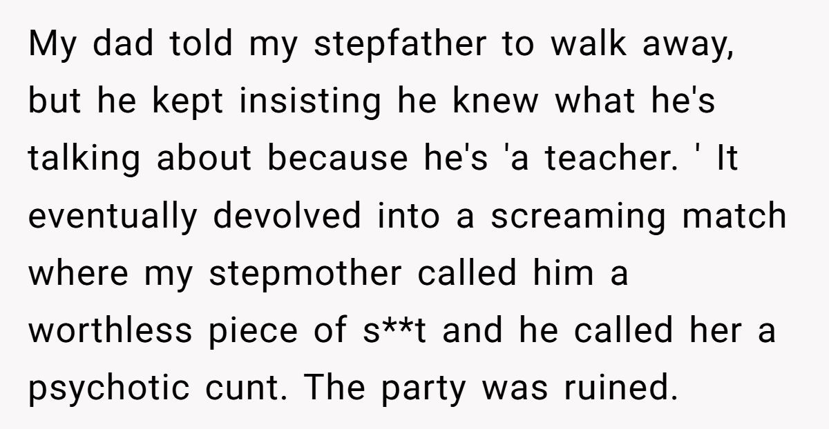 Despite being warned in advance to keep things light, the stepfather pushed forward, touting his background as a teacher to justify his unsolicited input. His remarks struck a nerve, and the resulting fight was loud enough to silence the celebration. Ever since, the Redditor has made no secret of their resentment—publicly and repeatedly reminding their stepfather of the chaos he caused.